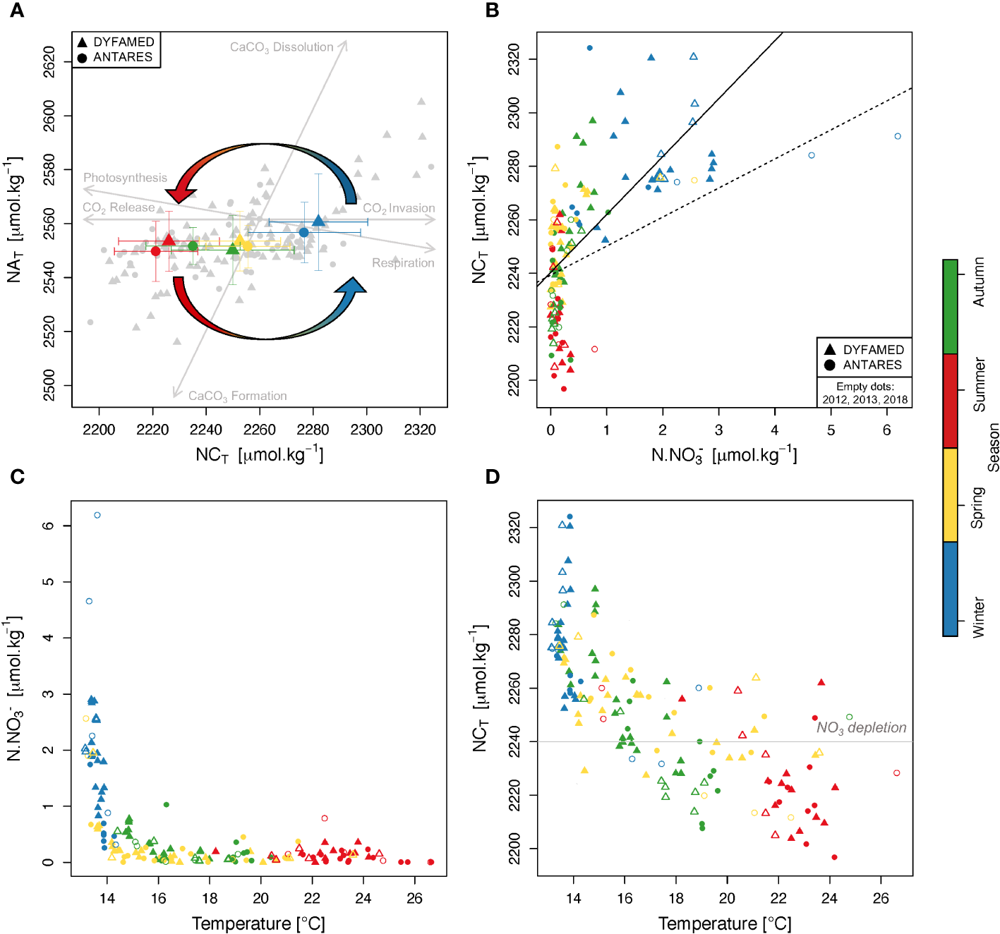 (A) Salinity-normalised AT (NAT) vs. salinity-normalised CT (NCT), (B) NCT vs. salinity-normalised NO3- (N.NO3-), (C) N.NO3- vs. temperature and (D) NCT vs. temperature within the mixed layer from January 2010 to December 2019 at ANTARES (circle dots) and DYFAMED (triangle dots). On figure (A), grey vectors reflect theoretical impacts of various processes (photosynthesis/respiration, carbonate dissolution/formation, CO2 release/invasion) on AT and CT adapted from Zeebe and Wolf-Gladrow [2001]. On (B–C) and (D), empty dots represent data measured during the winter deep-convection years of 2012, 2013 and 2018. On (B), full and dotted lines represent the linear regressions for DYFAMED and ANTARES, respectively. The colour scale corresponds to the season: winter in blue (January – March), spring in yellow (April – June), summer in red (July – September), and autumn in green (October – December).