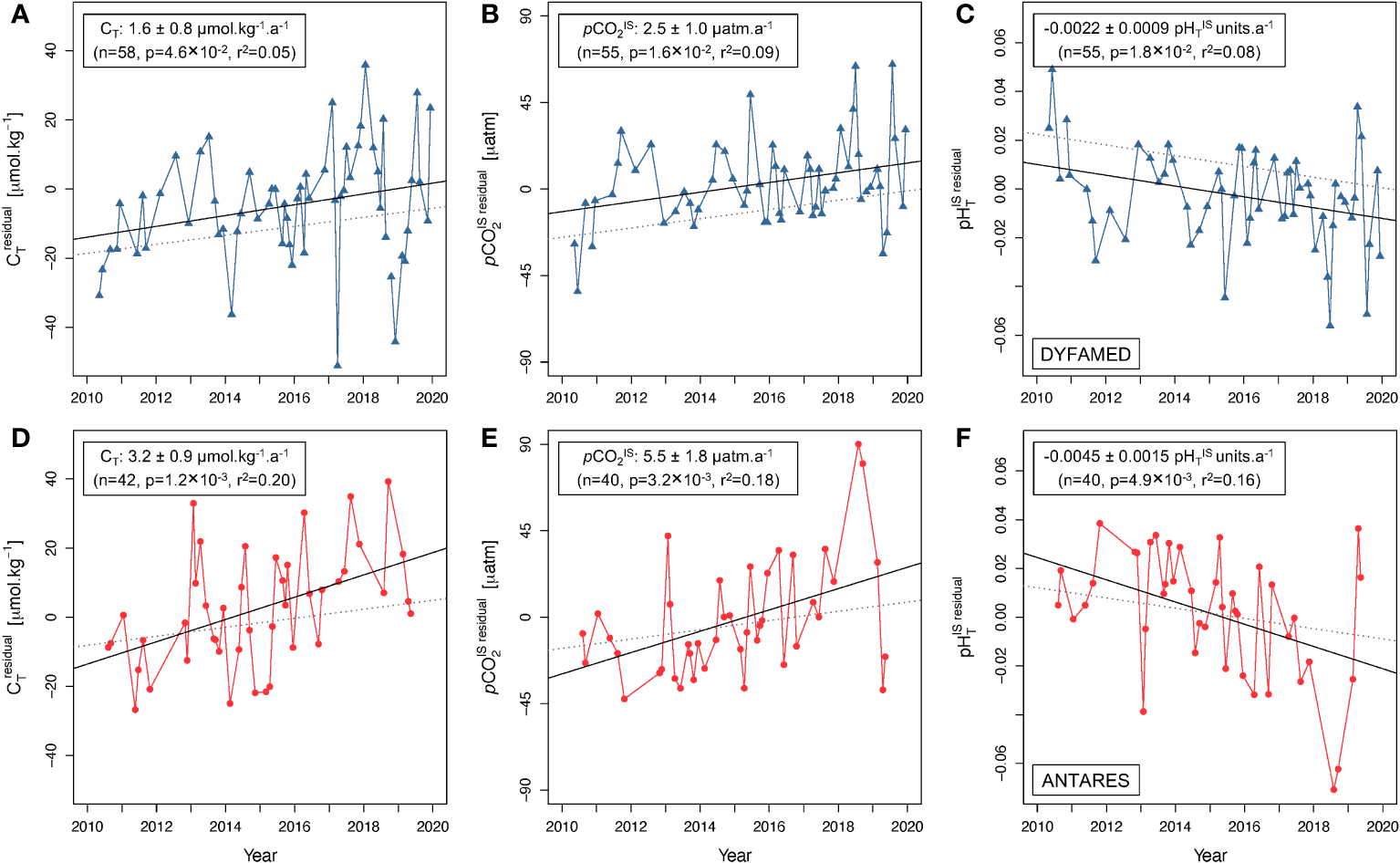 Using the raw datasets at ANTARES and DYFAMED, an increase in CT within the mixed layer between 2010 and 2019 of +3.8 ± 1.4 µmol.kg−1.a−1 at ANTARES and +2.4 ± 1.1 µmol.kg−1.a−1 at DYFAMED was estimated (Table 3). Trends were not significant for pCO2IS and pHIS at DYFAMED. Moreover, no significant trends were observed for either AT or NAT at either site. Due to the strong seasonal cycle affecting the CT content (but also the pCO2 and pH), the trends reported could be affected by the data distribution along the year. To address this issue, datasets have been “deseasonnalised”. This analytical procedure allows the comparison of trends with different increments and lengths [Wanninkhof et al., 2019]. The long-term temporal trends have been calculated using the residual between the harmonic fits and measured values. At both sites, the deseasonnalised datasets were significantly different (t-test according to the significance of the test (p-value) and the degree of freedom (df) obtained) in comparison with the raw datasets for CT, pCO2IS and pHIS (Figure 6). Based on the deseasonnalised datasets, significant increases in CT (+3.2 ± 0.9 µmol.kg−1.a−1 – ANTARES; +1.6 ± 0.8 µmol.kg−1.a−1 – DYFAMED), seawater pCO2IS (+5.5 ± 1.8 µatm.a−1 – ANTARES; +2.5 ± 1.0 µatm.a−1 – DYFAMED) and decreases in pHIS (-0.0045 ± 0.0015 pH unit.a−1 – ANTARES; -0.0022 ± 0.0009 pH unit.a−1 – DYFAMED) have been measured within the mixed layer between 2010 and 2019 (Figure 6, Table 3). This confirms that the estimation of long-term trends is impacted by the seasonal variability of the environmental parameters, and it supports the deseasonnalisation procedure used in this study to calculate the temporal trends. Nevertheless, trend estimates for DYFAMED are in good agreement with previous estimates at this site [e.g., Merlivat et al., 2018; Coppola et al., 2020], whereas the trends calculated at the ANTARES site are significantly higher than at DYFAMED. Recently, Sutton et al. (2022) proposed new best practices for assessing trends of ocean acidification time-series. For the first time, several trend analysis techniques that have been published in the past have been packaged together into a set of best practices. Through a unique and new 6-step sequence of procedures, a new best practice for assessing and reporting ocean acidification trends as well as variability in ocean carbonate has been proposed. By applying these trend analysis techniques to the ANTARES and DYFAMED datasets, significant decreases in pHIS of -0.0060 ± 0.0012 pH unit.a−1 (n=42, p=1.9×10-5) and -0.0018 ± 0.0009 pH unit.a−1 (n=58, p=4.6×10-2), respectively, have been obtained. Trends assessed following this procedure are in agreement with the ones derived using the deseasonalised datasets, confirming a higher seawater pH decrease at ANTARES than at DYFAMED.
