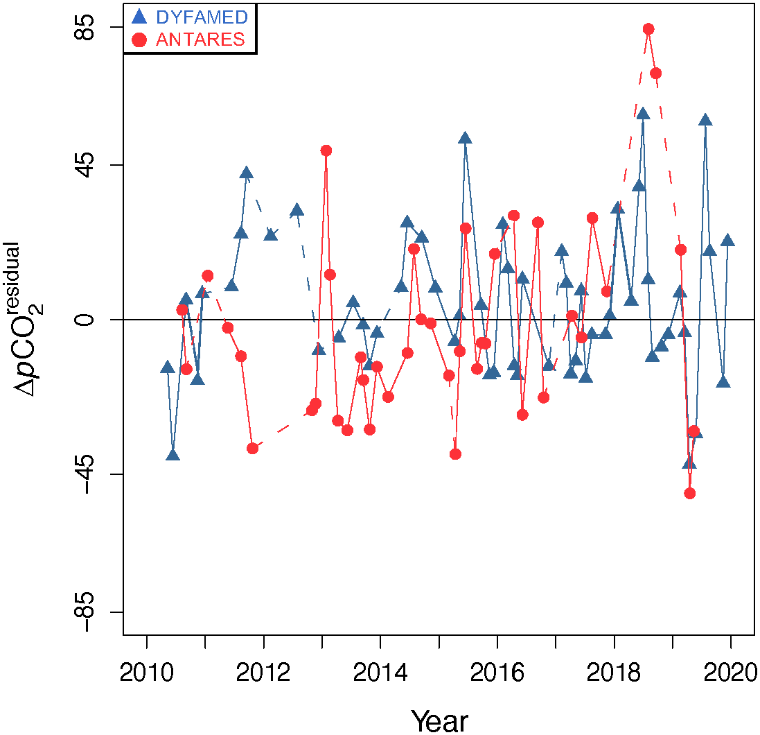 In the NW Mediterranean Sea, seasonal cycles of carbonate chemistry parameters presented almost similar functioning at ANTARES and DYFAMED. This section will focus on the long-term variability and evaluate whether both sites are analogous in terms of carbonate chemistry changes over ten years.