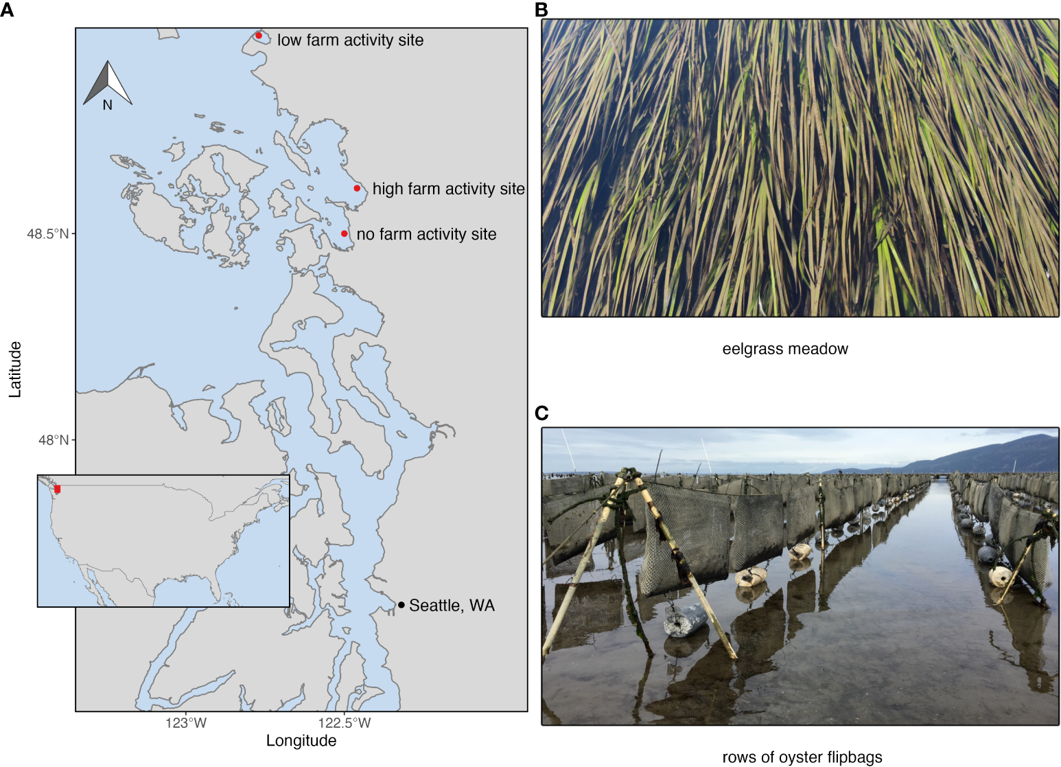 Within the North Puget Sound region there are extensive tracts of eelgrass meadows, bivalve farms, and mudflats, within different bays and inlets. Two examples of Puget Sound areas with bivalve farming are Samish Bay and Drayton Harbor, which are used for growing oysters and other bivalves. In Samish Bay, a large amount of tide flat area is dedicated to bivalve farming, where multiple shellfish companies have grown oysters, clams, and other bivalves using loose bottom culture, mesh bags, nets, and long lines across approximately 5,200 acres of tide flat since the early 1900’s (Steele, 1964; Washington State Department of Health, 2022). Drayton Harbor has comparatively much less aquaculture, with one oyster farm using less than two acres of tide flat for active farm operations. Both areas encompass extensive eelgrass meadows adjacent to, and often immediately surrounding farmed areas, with eelgrass, macroalgae, or bare mudflat substrates within the active farm area. There are approximately 650 acres of eelgrass in Drayton Harbor, and 5,100 acres that contain eelgrass in Samish Bay (Washington State Department of Natural Resources, 2022). However, eelgrass cover and density are not uniform across either site, with most of the farm area in Samish Bay overlapping the area that contains eelgrass (Washington State Department of Health, 2022; Washington State Department of Natural Resources, 2022). Other areas within North Puget Sound such as Padilla Bay National Estuarine Reserve serve as protected estuarine reserves with no bivalve farming activity. Padilla Bay has the second largest eelgrass meadow on North America’s Pacific coast with over 8,000 acres of eelgrass (Shull and Bulthuis, 2002). We chose our study sites to fall along a gradient of farming activity representative of the different site conditions in the North Puget Sound: Padilla Bay represented a site with no farming activity, Drayton Harbor represented a site with low farming activity surrounded by dense eelgrass meadows, and Samish Bay represented a site with high farming activity within a patchwork of thousands of acres of farms, eelgrass meadows, and mudflats. Specific percent cover of farm versus unfarmed area was not available for each site, so the sites were categorized as ‘no farming activity’, ‘low farming activity’, and ‘high farming activity’.