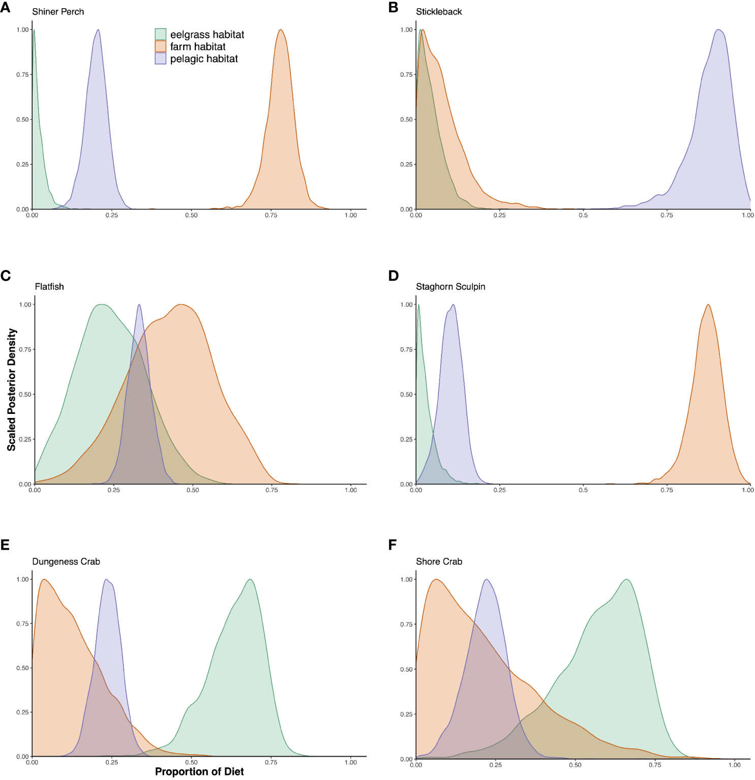 Posterior probability densities of estimated diet sources for each consumer species. (A) Shiner perch, (B) Stickleback, (C) Flatfish, (D) Staghorn sculpin, (E) Dungeness crab, (F) Shore crab. Light green represents the estimated diet percentage coming from eelgrass type habitat, light red represents the estimated diet percentage coming from farm type habitat, and light purple represents the estimated diet percentage coming from pelagic type habitat. The peaks for each diet source represent the highest probability diet percentage coming from that source.