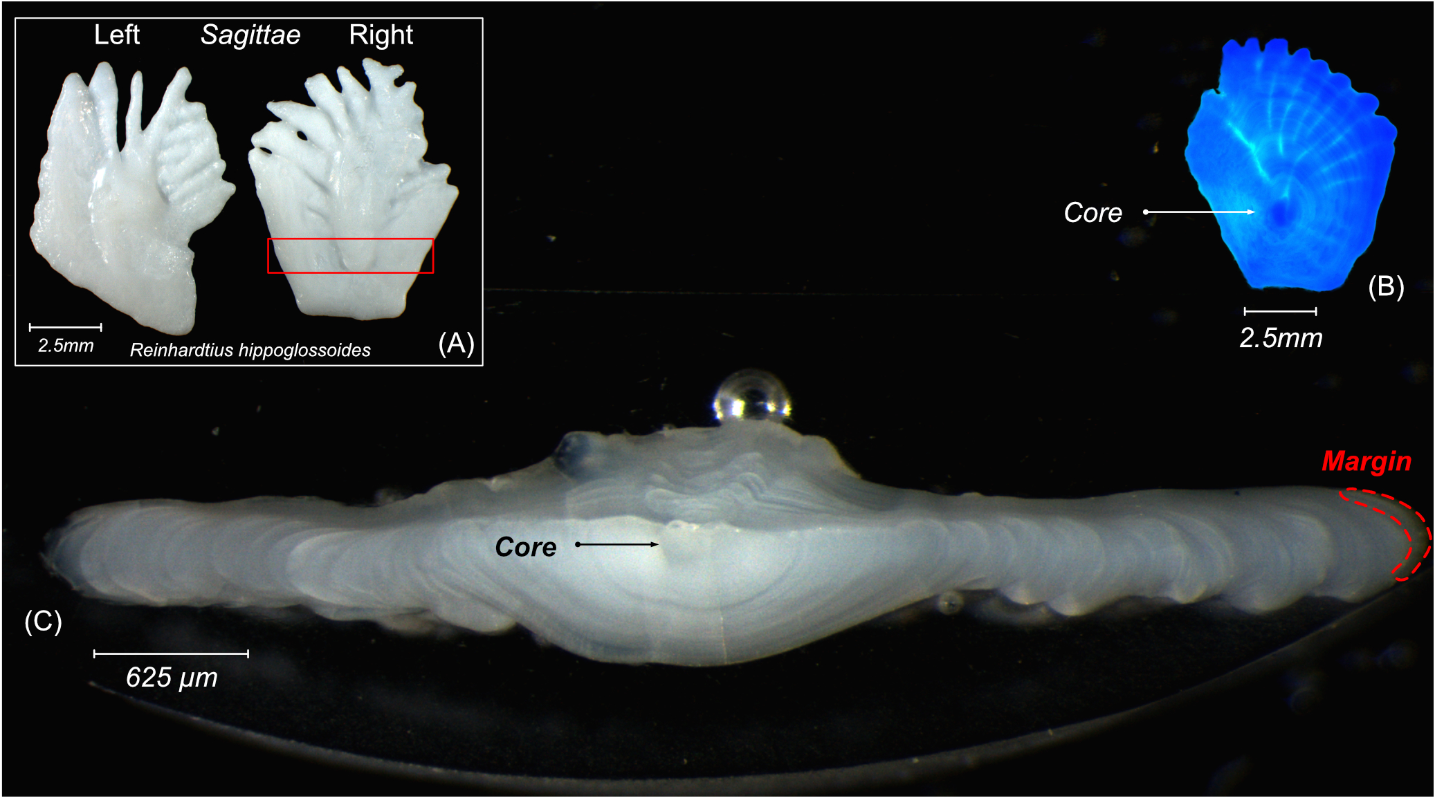 (A) Pair of otoliths extracted from Greenland Halibut (Ć8 magnification). Section in red rectangle is presented in (C); (B) core of a right sagittal otolith under blue LED (Ć8 magnification); (C) cross-section of an otolith slice showing the location of the core and margin (Ć25 magnification).