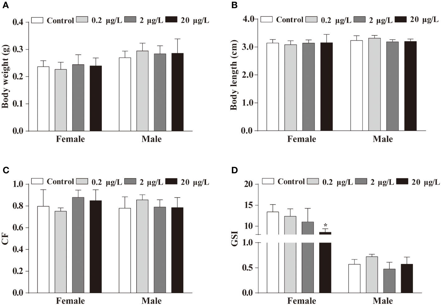 Effects of life cycle exposure to PBSA on the growth of adult zebrafish. (A, B) Body weight (A) and body length (B) of adult zebrafish after life cycle exposure to PBSA. (C) Condition factor indices in adult zebrafish. (D) Zebrafish gonadosomatic index. Values plotted are mean ± SEM. *P < 0.05 indicate significant differences between the control and exposure groups.