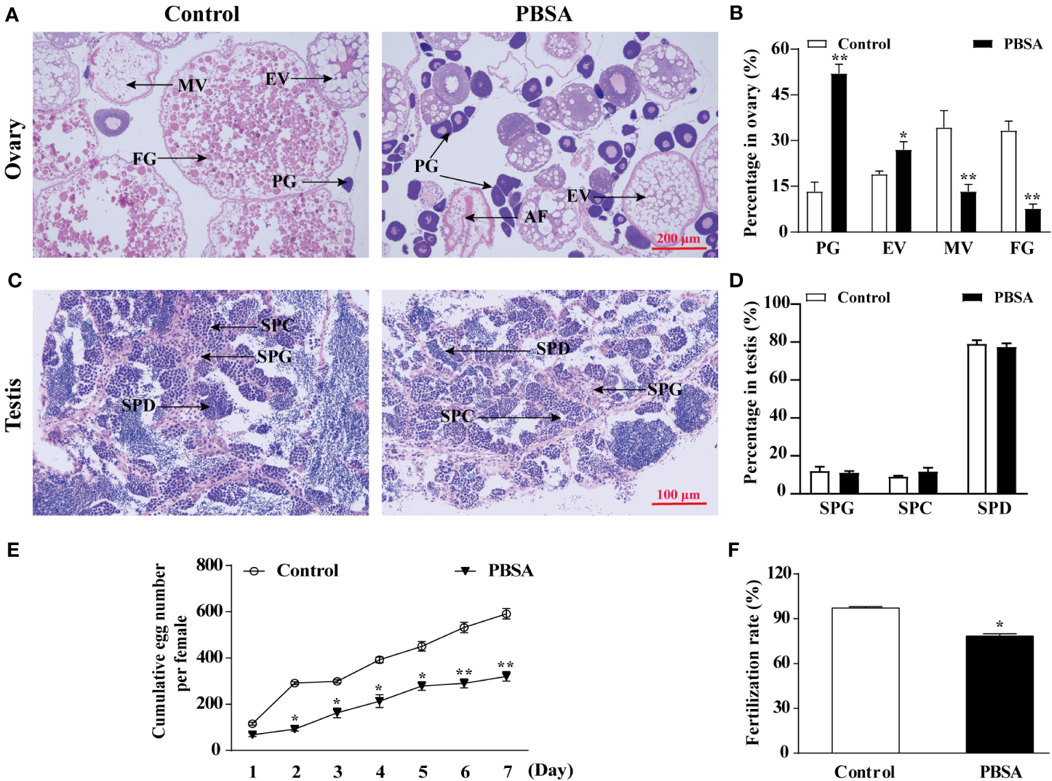 Effects of PBSA on reproduction of adult zebrafish. (A) Representative images of ovaries of adult zebrafish stained with hematoxylin-eosin (H&E) (PG, primary growth follicles; EV, early vitellogenic follicles; MV, midvitellogenic follicles; FG, full grown follicles). (B) Percentage of oocyte in ovaries at different stages. (C) Representative images of testis of adult zebrafish stained with H&E (SPG, spermatogonia; SPC, spermatocytes; SPD, spermatids). (D) Percentage of testis cells in testis at different stages. (E) Cumulative egg numbers per female over 7 days after life cycle exposure to PBSA (n = 3 × 3; 3 repeats with 3 female/3 male fish per repeat). (F) Fertilization rate (n = 3 × 3; 3 repeats with 3 female/3 male fish per repeat). Values plotted are mean ± SD. *P < 0.05, and **P < 0.01 indicate significant differences from the vehicle control.