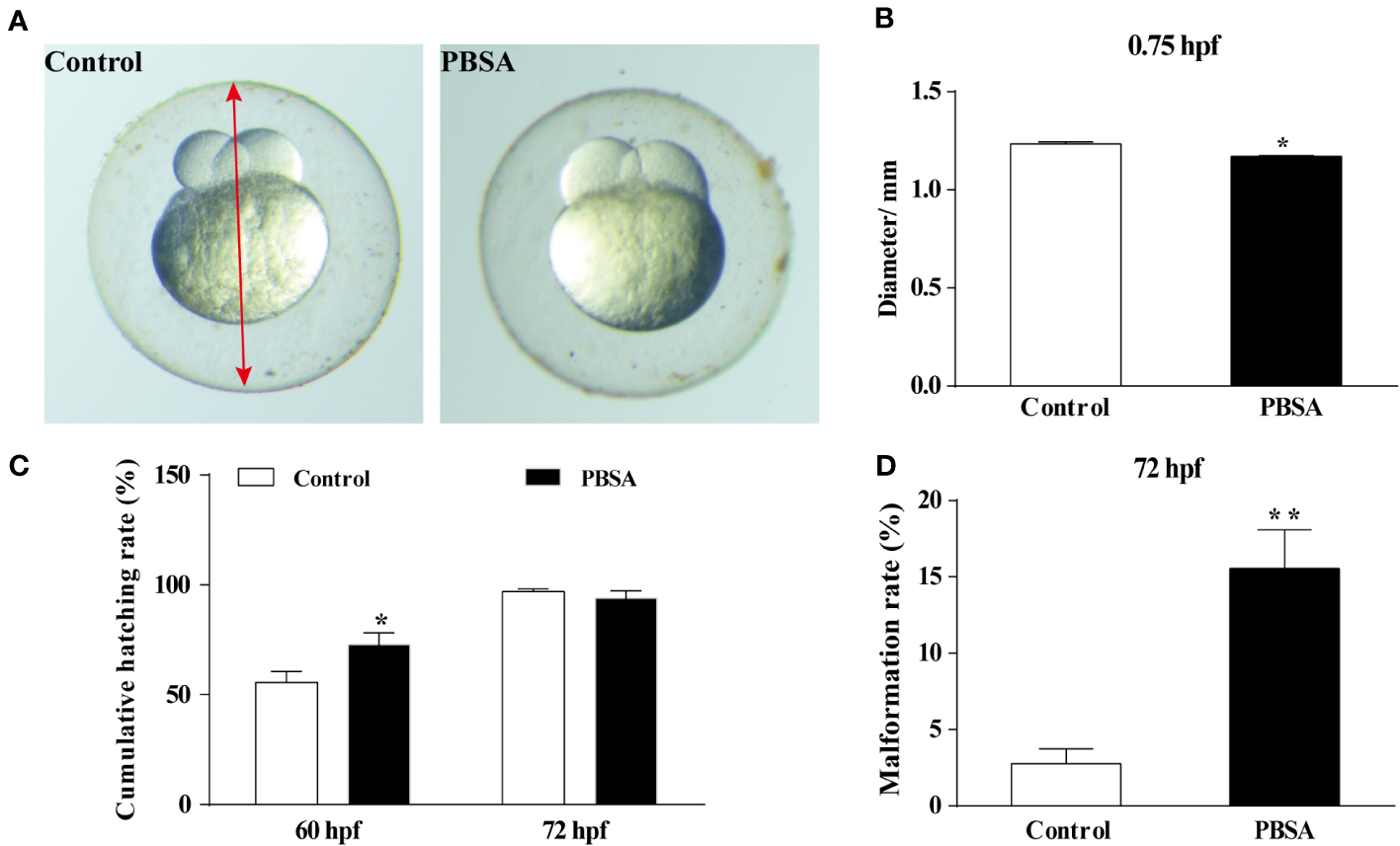 Effects of PBSA on the development of embryos in F1 generation. (A) Representative image of F1 generation embryos at 0.75 hpf, with the red arrow denoting the egg diameter. (B) Egg diameter of embryos at 0.75 hpf (n = 3 × 20). (C) Cumulative hatching rate of F1 generation embryos at 60 and 72 hpf (n = 3 × 20). (D) Cumulative malformation rate of F1 generation embryos in 72 hpf (n = 3 × 20). Values plotted are mean ± SD. *P < 0.05, and **P < 0.01 indicate significant differences from the vehicle control.