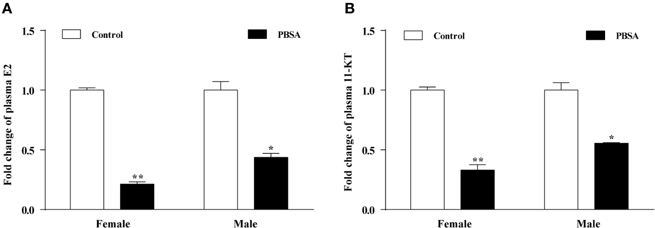 To investigate the possibility of endocrine disruption and reproductive dysfunction caused by an imbalance in sex hormones, we tested the plasma sex hormone levels. Results from ELISA analyses revealed that the plasma levels of E2 and 11-KT were significantly decreased in the PBSA exposure group compared to the control group for both male and female zebrafish (Figures 4A, B). Notably, the decrease in E2 and 11-KT levels was more pronounced in females, indicating that PBSA had a greater effect on them.