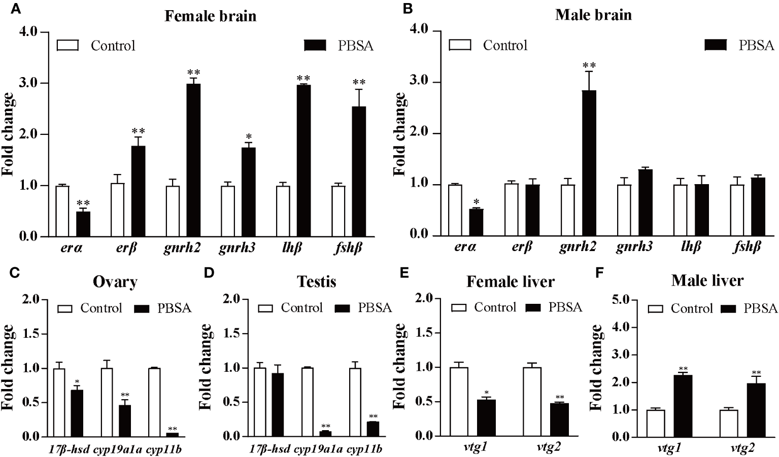 Effects of life cycle exposure to PBSA on the expression levels of genes in zebrafish brains (A, B), gonads (C, D), and livers (E, F). Values plotted are mean ± SD. *P < 0.05 and **P < 0.01 indicate significant differences from the vehicle control.