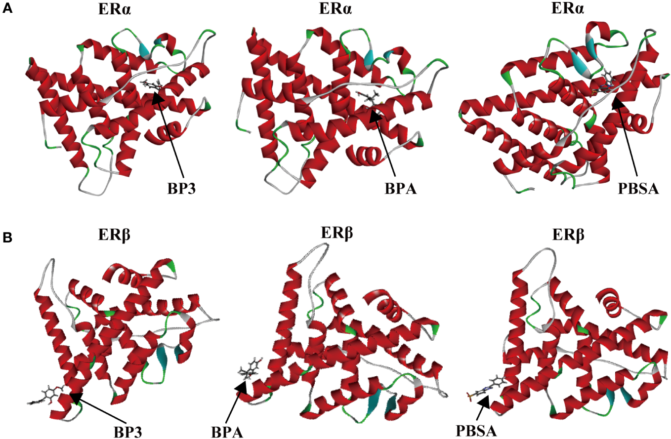 Binding modes between chemicals (BP3, BPA, and PBSA) and target proteins (ERα and ERβ). BP3-ERα, BPA-ERα, PBSA-ERα (A); BP3-ERβ, BPA-ERβ, PBSA-ERβ (B).