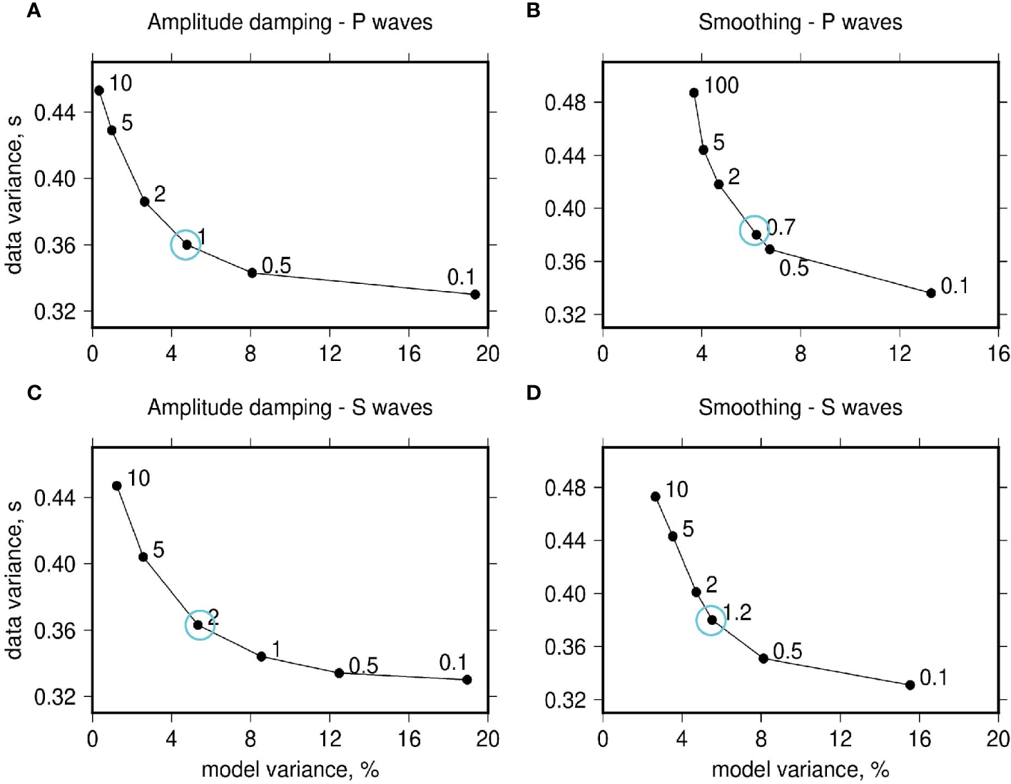 To parameterize the velocity model, we utilized a grid of nodes that were distributed throughout the study volume based on the ray density. In the map view, the nodes were evenly spaced with a 20 km interval, but only in areas with a ray density of at least 10% of the average ray density. In the vertical direction, the spacing between nodes was inversely proportional to the ray density. In regions where the number of rays is limited, the spacing between nodes is increased. To prevent an excessive clustering of nodes in areas with a high density of rays, we establish a minimum spacing of 10 km between nodes. This value is considerably smaller than the typical size of the anticipated anomalies. Overall, the grid utilized in our study consisted of 300 nodes for the Vp model and 313 nodes for the Vs model. We performed multiple inversions in grids with various basic orientations (0, 22, 45, and 66°) to minimize the effects of node distribution on the results (Koulakov et al., 2023). Finally, we stacked the results into one model. We utilized the LSQR algorithm (Paige and Saunders, 1982) to invert a sparse matrix for velocity anomalies, station corrections, source coordinates, and origin times. We performed a total of four iterations for both real and synthetic data inversions, which was an optimal balance between model stability and computational efficiency. The tomography inversion process enabled us to obtain three-dimensional distributions of the anomalies in Vp and Vs. By dividing the absolute values of the resulting Vp and Vs, we were able to calculate the Vp/Vs ratio. Table 1 displays the primary controlling parameters utilized in the inversion process. We determined the optimal values for these parameters by analyzing the trade-off curves (Figure 2), which illustrate the relationship between travel-time residuals and velocity perturbations for various damping and smoothing values (Eberhart-Phillips, 1986). The corner area of the trade-off curve represents the region where optimal values of parameters can be identified and implemented for the inversion process.