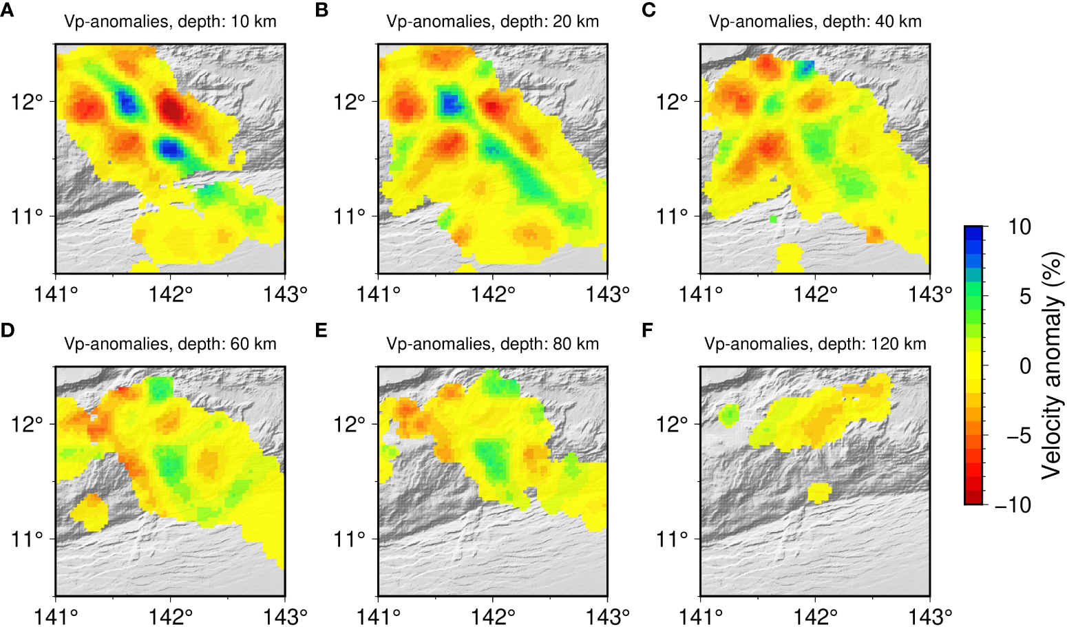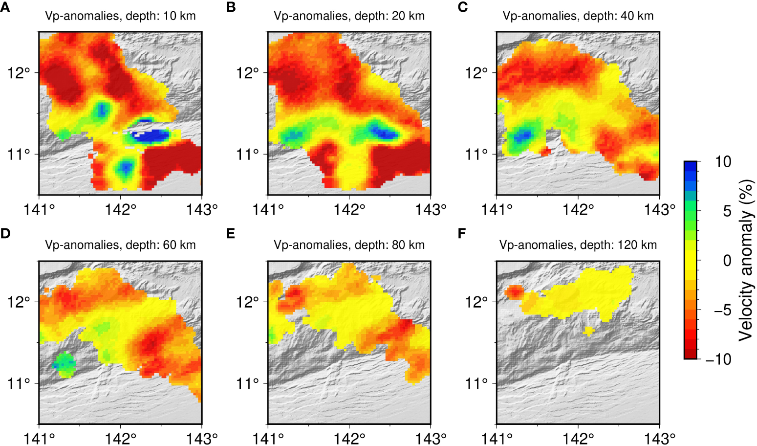 The distributions of the resulting anomalies of Vp at 10 km, 20 km, 40 km, 60 km, 80 km, and 120 km depth levels.