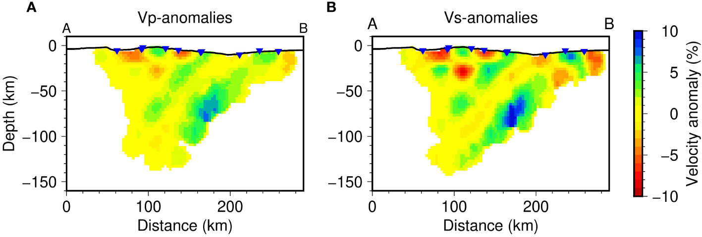 Concentrated low-velocity feature is detected beneath the forearc block, spanning from the uppermost mantle to 80 km depth. Low-velocity feature of this type have been recorded at comparable depths and locations underneath island arcs across different regions all over the world (Zhao, 2001; Syracuse et al., 2008; Barklage et al., 2015). The most prominent anomaly is found around 50 km depth, exhibiting a maximum velocity anomaly of -9% and a Vp/Vs ratio of 1.81. The observed values align with the average of 1.85 documented in numerous tomographic studies of island arcs in different regions worldwide (Wiens et al., 2008). The anomaly delineates the region in the mantle where magma is produced, which correlates with the reduced seismic velocity caused by the presence of partial melt. Therefore, we consider the forearc block to be more akin of an arc. However, there is limited dehydration of the subducting plate, meaning a lack of sufficient water supply, the magma may not be able to ascend to the surface and erupt. We image a 7% velocity anomaly beneath the SWMR and Vp/Vs of 1.8. The anomaly outlines the area below the spreading center where basaltic melts are created through the process of decompression melting.