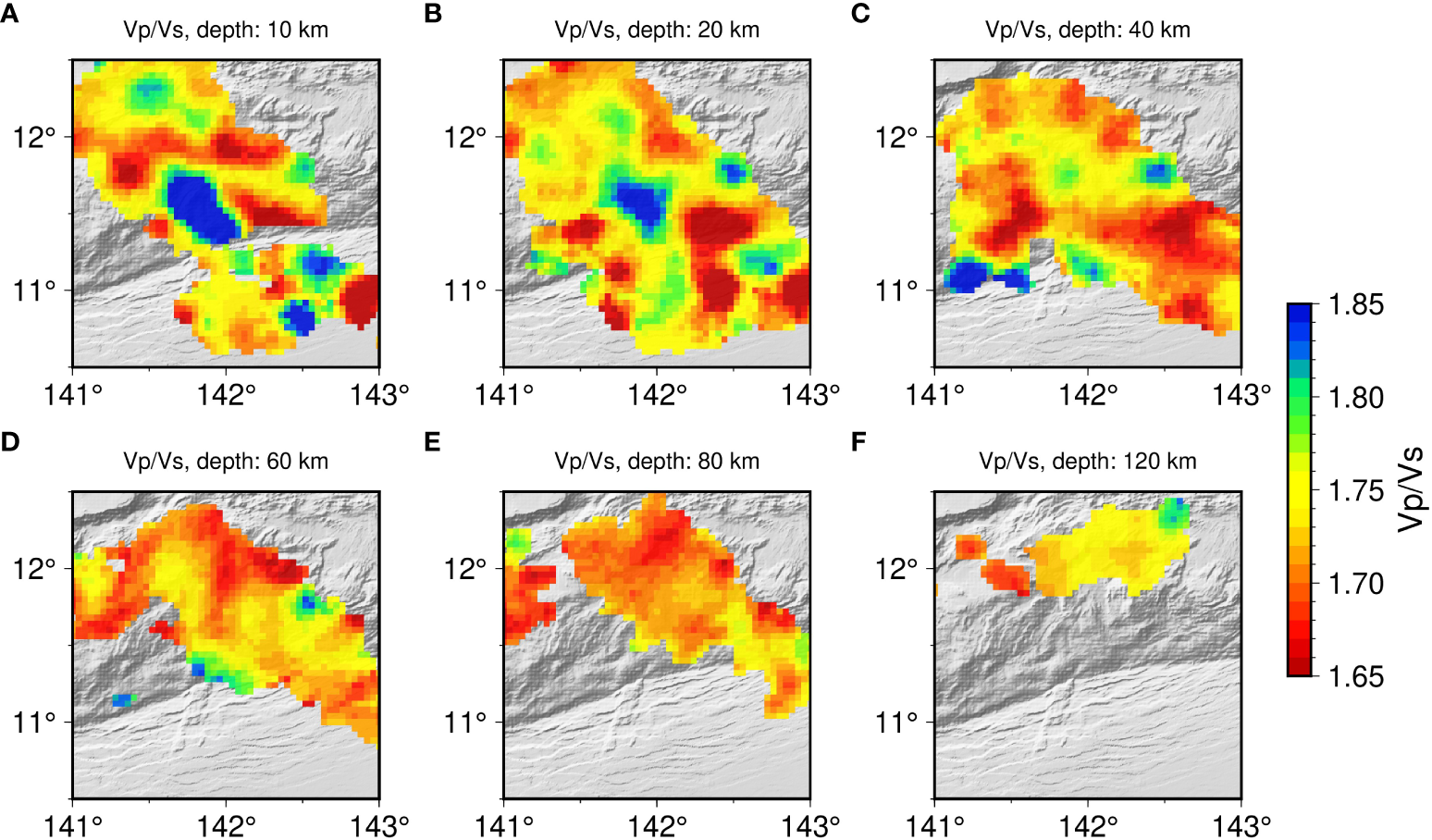 Figure 9C illustrates the most prominent aspect of the Vp/Vs structure, which is the presence of remarkably high Vp/Vs ratios within the outer forearc region. These ratios exceed 1.85 and persist from the uppermost mantle down to 50 km depth. High Vp/Vs ratios of 1.8 are also present beneath the central region of forearc block at depths of 40–60 km. The central region of the forearc exhibits an exceptionally low Vp/Vs ratio at shallow depths. Low Vp/Vs ratio also occur in the slab.