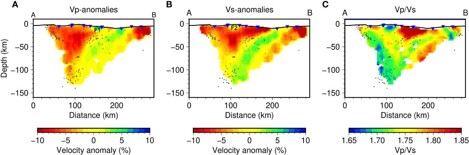 The distributions of the resulting anomalies of Vp, Vs, and Vp/Vs ratio in vertical section AB with the location shown in Figure 1. The black dots indicate the projections of seismic events located at distances of less than 50 km from the profile.