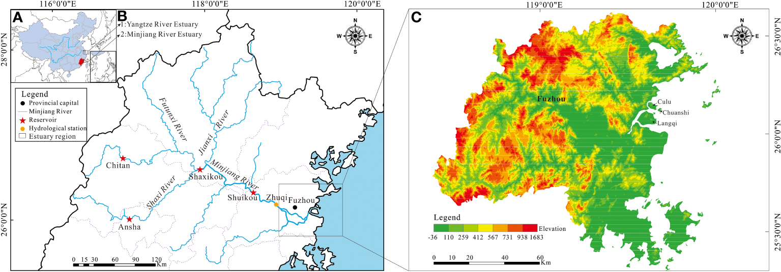 Location of the Minjiang River and the Minjiang River Estuary. (A) Location of Fujian Province; (B) Water system distribution map of Minjiang River Basin; (C) The surface elevation of Fuzhou and the location map of Minjiang River Estuary.