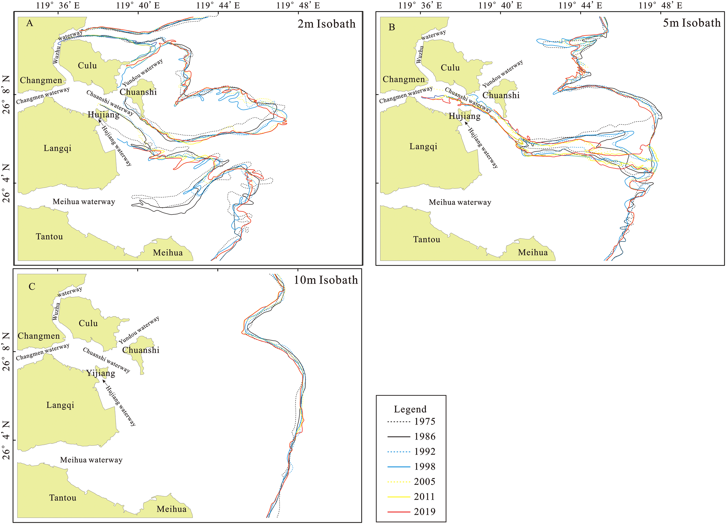 Isobath Distribution Map of the Minjiang River Estuary (1975-2019). (A) 2 m Isobath; (B) 5 m Isobath; (C) 10 m Isobath.