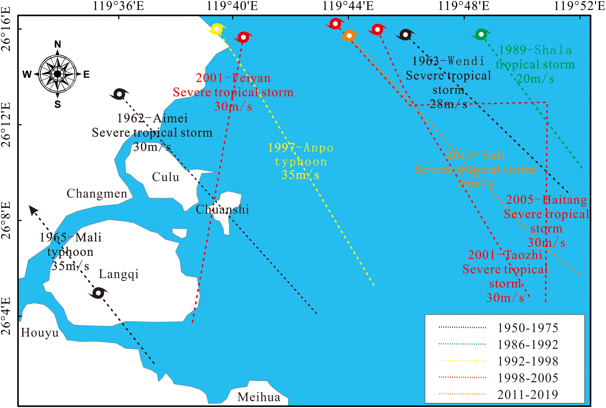 Typhoon paths passing through the area of the Minjiang River Estuary.