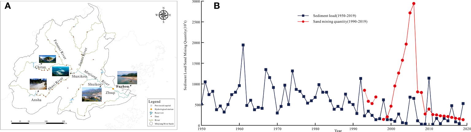 The MR (Figure 1B) originated from the eastern foot of Wuyi Mountain and the southern foot of Xianxialing at the junction of Fujian Province and Jiangxi Province. It is controlled by the fault structure to form a typical lattice water system. It generally runs northwest-southeast across the central and northern parts of Fujian Province and flows into the Taiwan Strait through Fuzhou. The total length is 2,872 km, the total length of the mainstream is nearly 577 km, and the basin area is 60,992 km2, accounting for half of the total area of Fujian Province (Wang et al., 2022). Among them, the upper reaches of Nanping are upstream, the middle reaches from Nanping to Anrenxikou are middle reaches, and the lower reaches below Anrenxikou are downstream. The basin is located in the subtropical marine monsoon climate zone. The annual precipitation is between 1400 and 2400 mm, and the precipitation gradually decreases from the upstream to the downstream, from the northwest mountain area to the southeast coast. The MR Basin is rich in water and less in sediment, and the runoff is large. The average annual runoff is 605.5 × 108 m3. The suspended sediment concentration of the river is small, and the average annual sediment transport is only 750 × 104 t. Since the construction of the Shuikou Dam (Construction began in 1987, the first unit was put into operation in 1993, and all units were completed and put into operation in 1996), the sediment transport has decreased significantly, and the average annual sediment transport since 1993 is only 248 × 104 t (Lai et al., 2023).