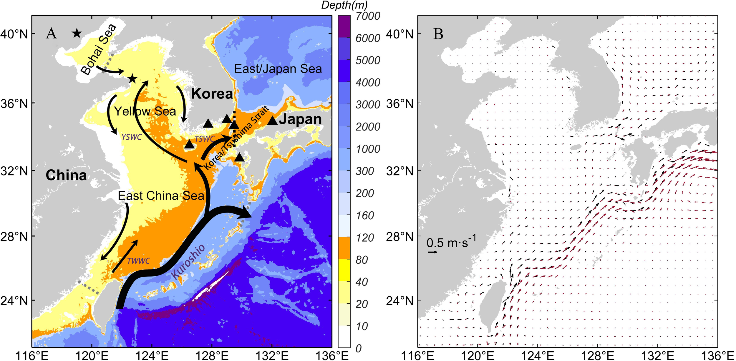 (A) Bathymetry of the study region and the wintertime regional circulation in the Yellow Sea and the East China Sea. TWWC: Taiwan Warm Current; TSWC: Tsushima Warm Current; YSWC: Yellow Sea Warm Current. The black dotted line is the location of the Korea/Tsushima Strait section. The gray dotted lines are the Bohai Strait, the Tokara Strait and the Taiwan Strait, respectively. The black pentagrams are the locations of Qinhuangdao and Chengshan Cape (from north to south). The black triangles are tide gauge stations for Jeju, Yeosu, Busan, Tsushima, Nagasaki, and Hamada (from west to east). (B) The annual mean sea surface geostrophic current field calculated by satellite altimetry data and modeled sea surface height (SSH) data. The black vectors are the modeled current, and the red vectors are from the Archiving, Validation and Interpretation of Satellite Oceanographic (AVISO).