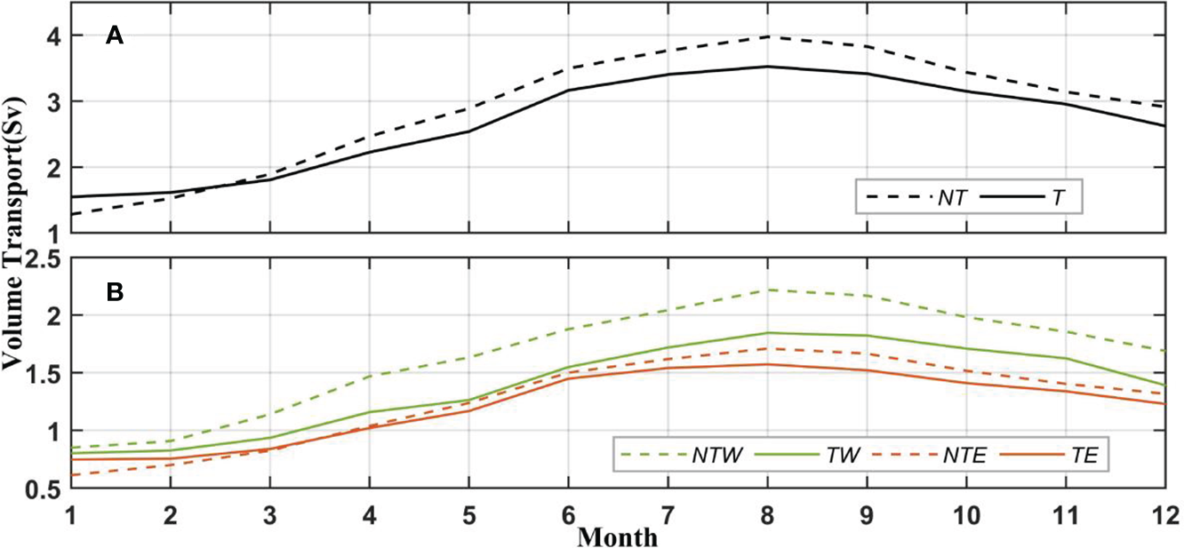 Monthly mean water flux across the KTS calculated considering (A) circulation with no tides (NT) and circulation with tides (T) and including the corresponding fluxes separately across the (B) Western Channel (NTW/TW) and Eastern Channel (NTE/TE).