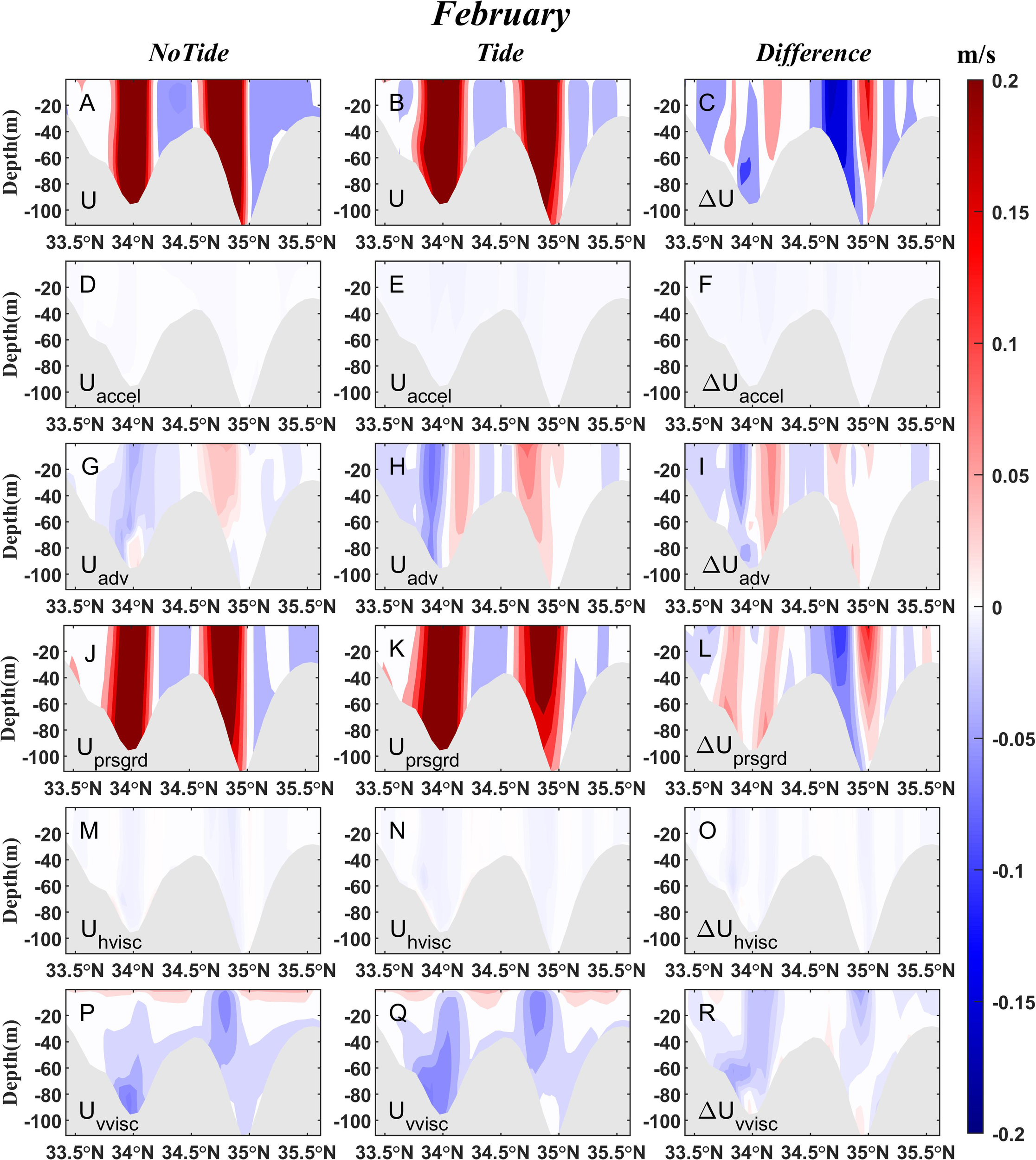 (A-C) Current velocity (m/s) through the KTS transect and (D-R) each term in the momentum balance equation in February 2021. The left panel is the case without tides, the middle panel is the case with tides, and the right panel is the difference (Tide- NoTide) between the experiments with and without tides.
