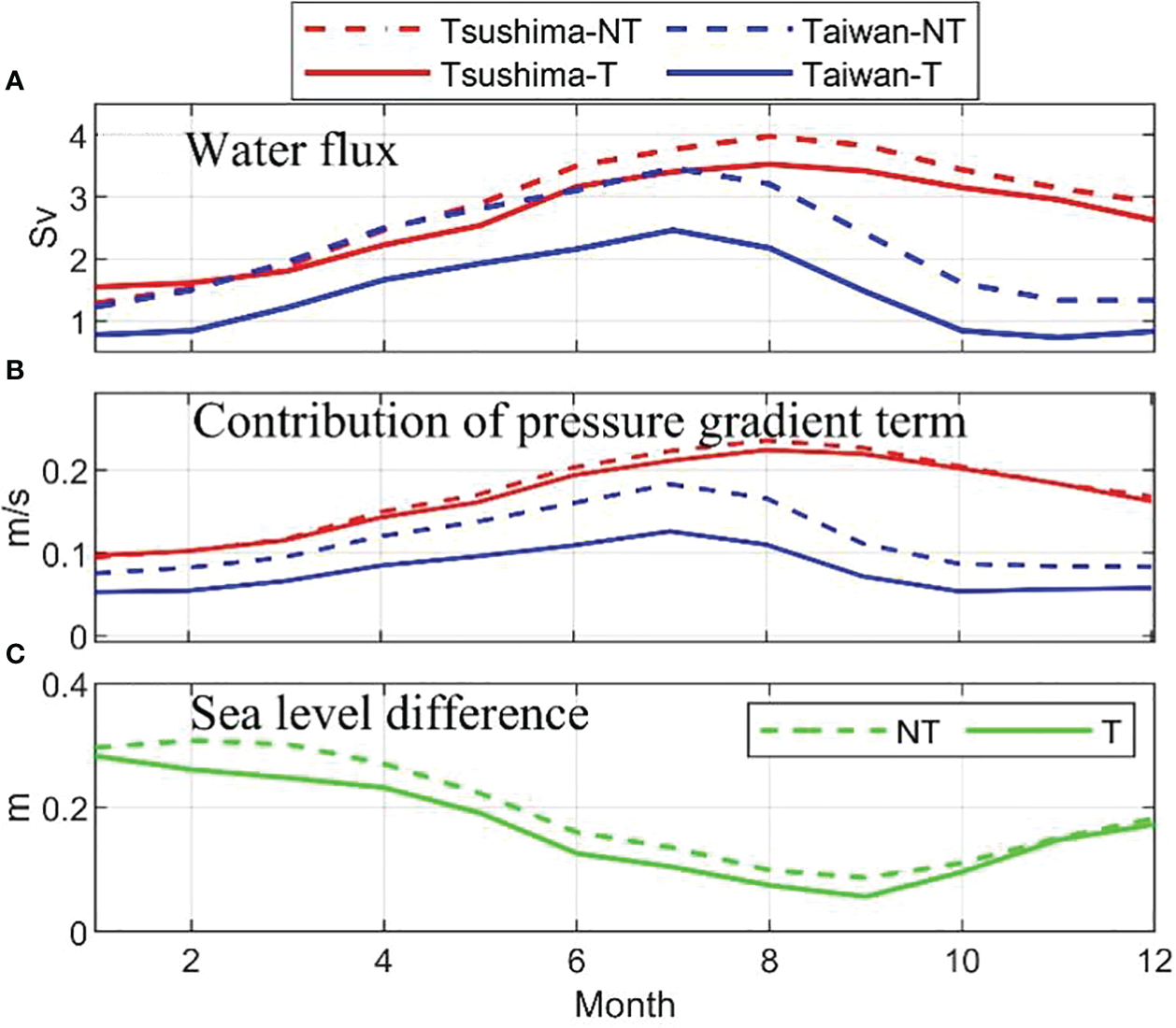 (A) Water flux (Sv) across the Korea/Tsushima Strait and Taiwan Strait and (B) the contribution of vertical integrated pressure gradient term (m/s). (C) The sea level difference (m) between the two straits. Where NT represents no tides, T represents tides. The contribution of pressure gradient term is detailed in section 4.2.