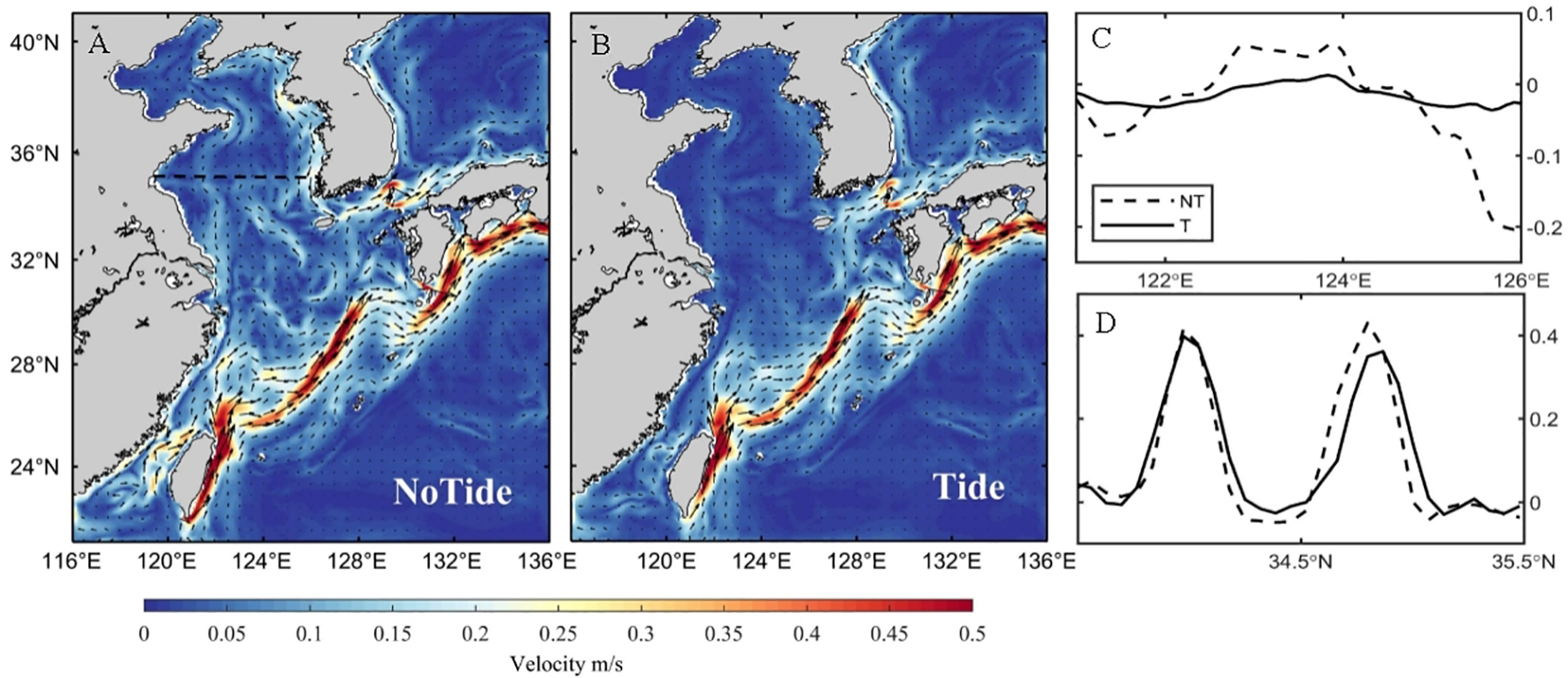 Based on the above analysis, it is theorized that tides change the sea surface gradient in the KTS by decreasing the sea level difference between the Taiwan Strait and the KTS, as well as by the interaction with topography and stratification, thereby reducing the water flux through KTS throughout the year.But it is interesting to note that tidal effect enhances the KTS water flux in winter although it decreases the water flux in most months (Figure 10D). To address this abnormal behavior of tidal effect in winter, we checked the water flux across the 35°N transect. The monthly mean of vertically integrated current fields in the experiments with and without tides in February are shown in Figures 10A, B. The addition of tidal forcing induces significant changes in the North Jiangsu coastal current, and the flow along the west side of the Korean Peninsula. In addition, the YSWC also weakened in February. As shown in Figure 10C, the current velocity decreases in the 123–124°E region, corresponding to the weakening of the YSWC after applying tides in winter. The current velocity decreases in the coastal region near 126°E, corresponding to the weakening of the southward coastal current along the west side of the Korean Peninsula after applying tides. The northward intrusion of the YSWC is significantly weakened after applying tides (Figures 10A-C), and tidal forcing plays a key role in preventing the inflow of warm water. As shown in Figures 10A, B, the tidal forcing has little effect on the flow velocities in the source regions of the YSWC and TSWC, so we assume that the transport allocation between these two currents is based on a constant total transport. Due to the YSWC in winter, there is the strong temperature fronts on the both sides of the YSWC, the tidal effect enhances there, levels the steep SSH near the fronts and hinders its intrusion to the Yellow Sea. Then, more warm water flows eastward through the KTS into the EJS, resulting in the increase of water flux across the KTS in winter.