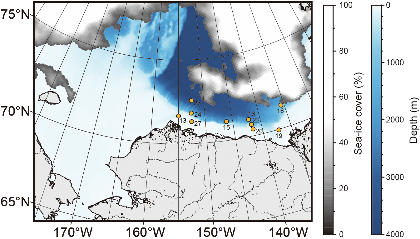 Location of sampling stations during cruise MR22-06C of the R/V Mirai from 30 August to 10 September 2022. Yellow circles indicate sampling stations. Grey shading represents the average sea-ice cover observed by the Advanced Microwave Scanning Radiometer 2 during the sampling periods.