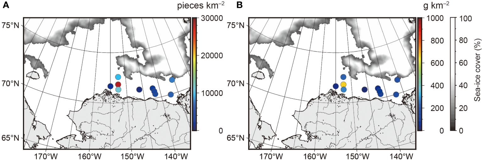 Although the Arctic Ocean is far from human habitation, MPs are transported from lower latitudes through ocean currents and the atmosphere (Mishra et al., 2021; Bergmann et al., 2022), and high concentrations of MPs have been reported from sea ice and snowfall (Peeken et al., 2018; Kim et al., 2021). The Pacific side of the Arctic Ocean (Chukchi Sea, Beaufort Sea, and East Siberian Sea) is one of the potential accumulation sites for plastic debris from the Pacific Ocean. However, quantitative data on MPs are biased toward the Atlantic side of the Arctic Ocean, and for the Pacific side there exists a gap in the MP distribution data (Ikenoue et al., 2023). Recently, the concentration of MPs in the Chukchi and Beaufort Seas was reported to be lower than that on the Atlantic side of the Arctic Ocean, suggesting relatively low inflows of MPs from the Pacific and Atlantic to this region (Ross et al., 2021; Ikenoue et al., 2023). On the other hand, focusing on the Pacific side of the Arctic Ocean, the total of 77 tons of MPs in the water of the Chukchi Sea cannot even explain the 420 tons of Pacific-origin MPs that enter the Chukchi Sea in a year, indicating that the Beaufort Sea, a downstream region of Pacific-origin water, may be one of the accumulation sites for Pacific-origin MPs (Ikenoue et al., 2023). However, the abundance (total number and weight) of MPs in the Beaufort Sea has not yet been estimated.