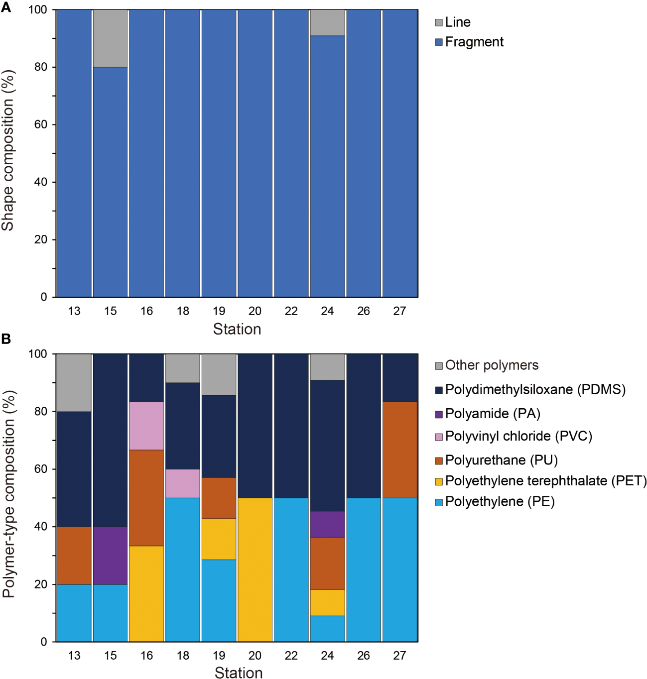 Composition of micro- and mesoplastic particles in the southern Beaufort Sea by (A) shape and (B) polymer type.