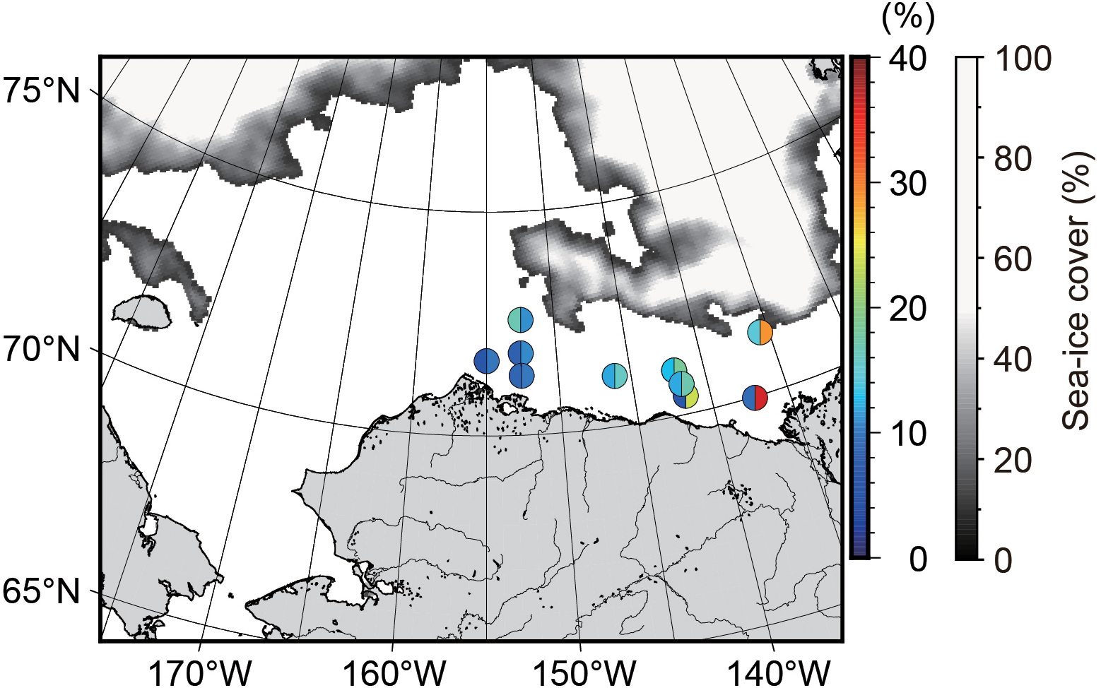 Seawater was collected by using a pump placed 4.5 m below the sea surface. Total alkalinity was then calculated from pCO2, TCO2, temperature, and salinity (Murata et al., 2022). The fractions of sea-ice meltwater and other freshwaters (consisting of precipitation, riverine water, and freshwater carried by Pacific-origin water) in surface seawater at a depth of 4.5 m during the sampling period were calculated from salinity and total alkalinity as described by Yamamoto-Kawai et al. (2005). The southern Beaufort Sea is likely influenced by the water originated in the Chukchi Sea, where North American rivers characterize the endmember values of freshwater other than the sea-ice meltwater (Nishino et al., 2016). Thus, we used their endmember values as the optimal values for endmembers in the southern Beaufort Sea. For Stns. 18 and 19 at the mouth of the Mackenzie River with salinity<20, however, end-member values of 1900 mmol kg–1 (Telang et al., 1991) were used for the total alkalinity of the other freshwaters. The salinity and total alkalinity values used in the calculations were those at the time of neuston-net sampling for each station; however, if the corresponding measurements did not exist, we used the measurements from the location and time as close as possible to those of the neuston-net sampling.