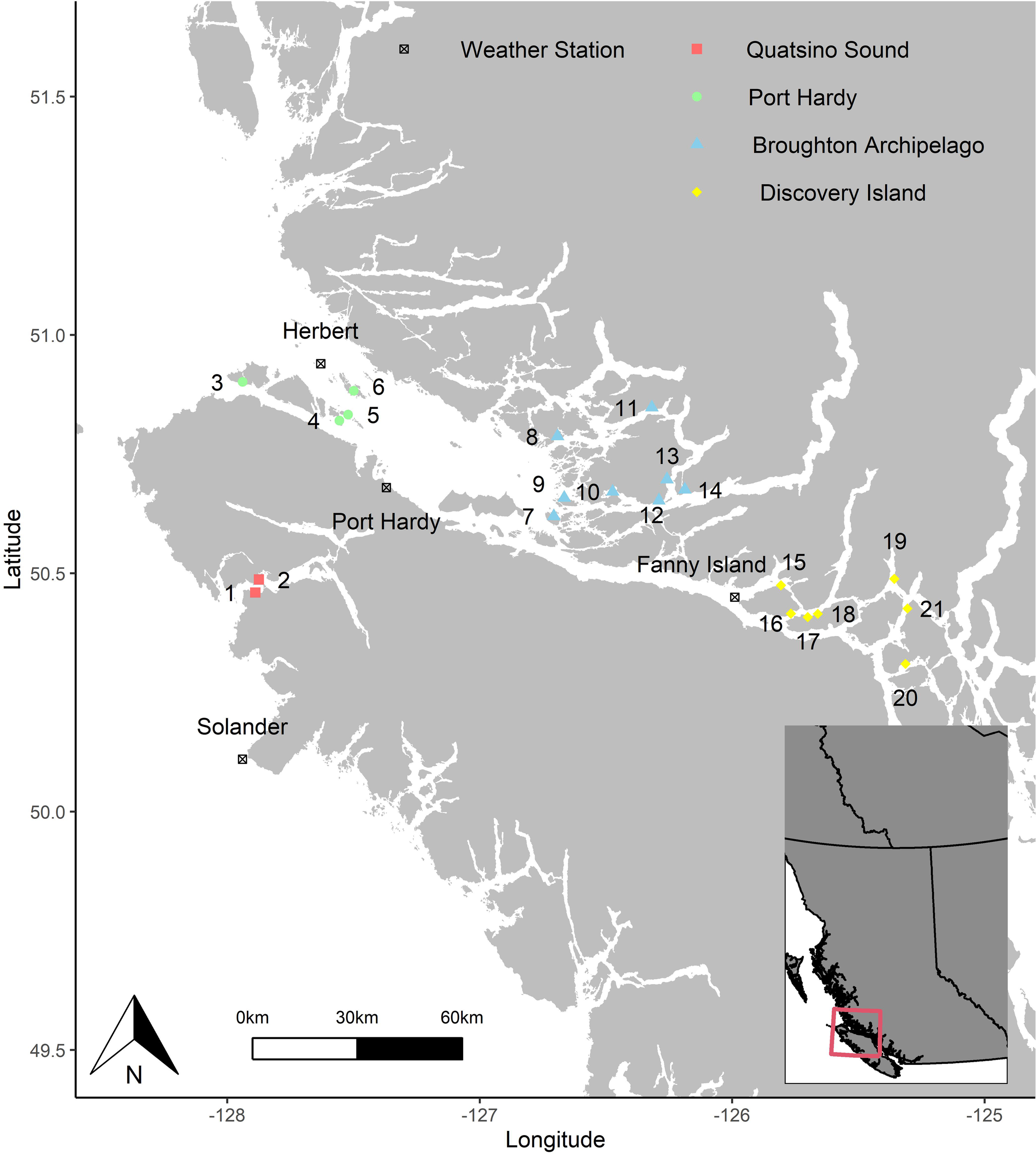 Locations of the 21 salmon aquaculture sites and the four weather stations in British Columbia, Canada. The sites are numbered from 1 to 21 and grouped into four areas (Red: Quatsino Sound, Green: Port Hardy, Blue: Broughton Archipelago, and Yellow: Discovery Island). The four black symbols (boxed ‘x’) mark the weather stations that provided the environmental data.