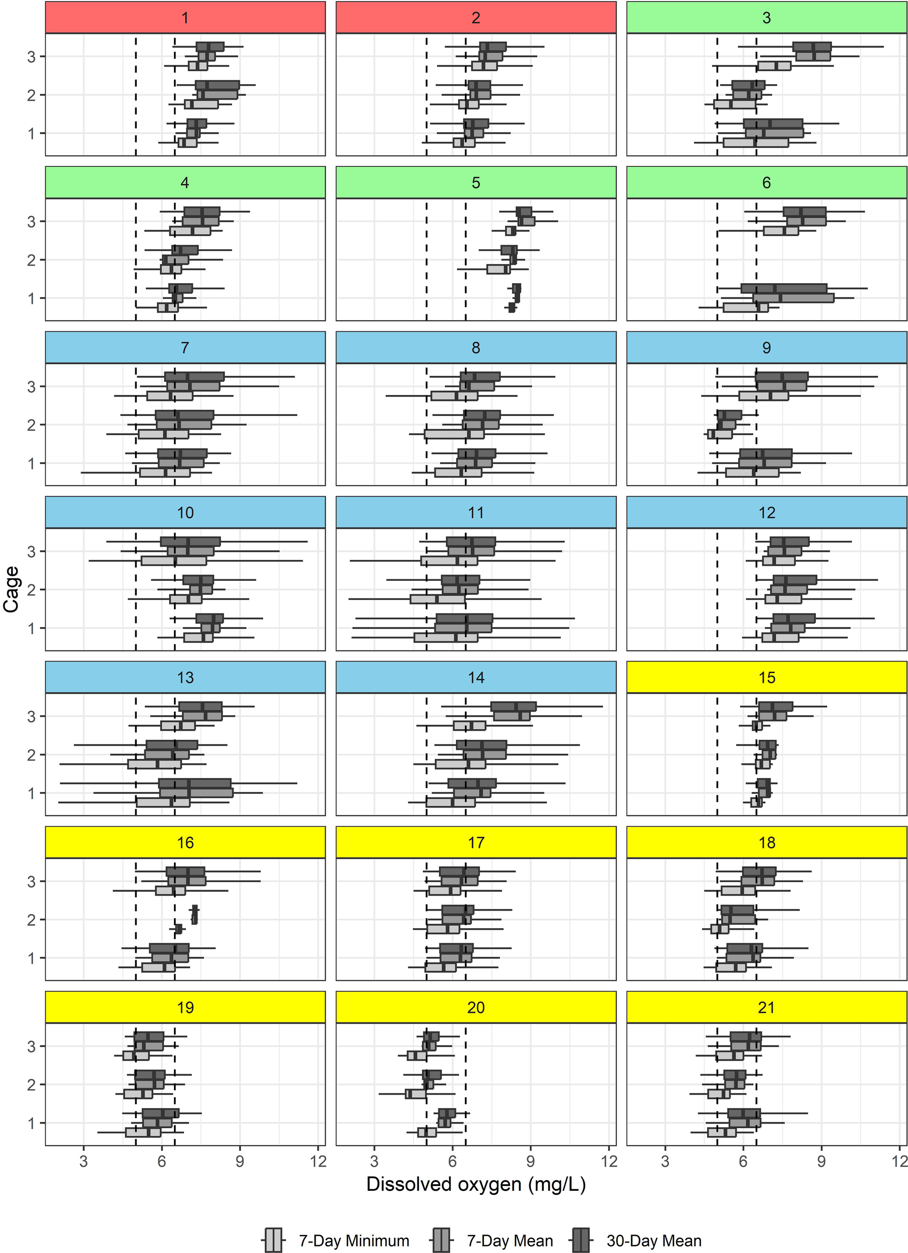 Two-number criteria summaries of 7-day minimum, 7-day mean, and 30-day mean. The dashed vertical black lines at 5 mg/L represent the criterion for 7-day minimum, and the dashed vertical black lines at 6.5 mg/L represent the criteria for the 7-day mean and the 30-day mean. The color for each site corresponds to its respective aquaculture area (see Figure 1).