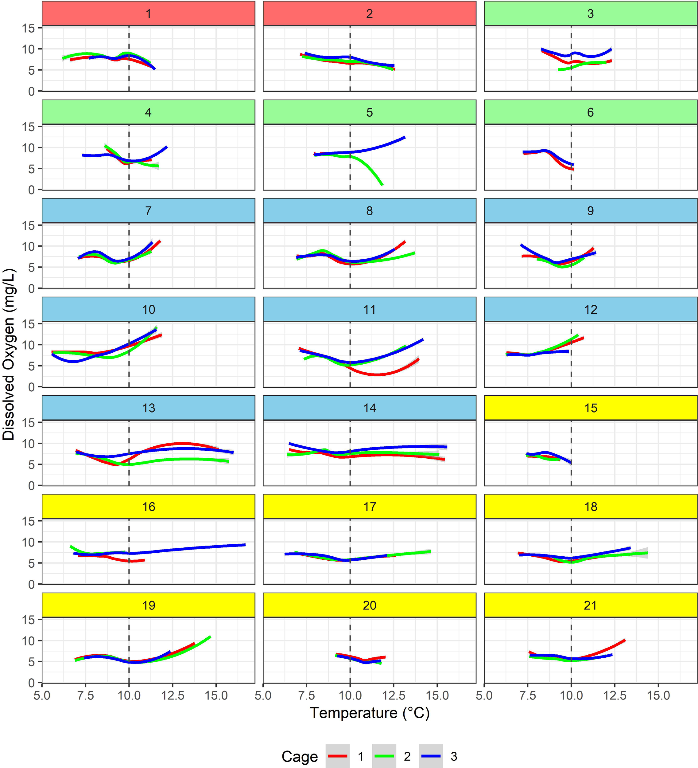 Locally-weighted smoothing (LOWESS) line plots showing the relationship between hourly dissolved oxygen concentration and temperature for each cage within each of the 21 aquaculture sites. The time-series regression models included temperature as a linear spline, with a knot placed at 10°C, marked here for reference (dashed vertical lines). The color for each site corresponds to its respective aquaculture area (see Figure 1).