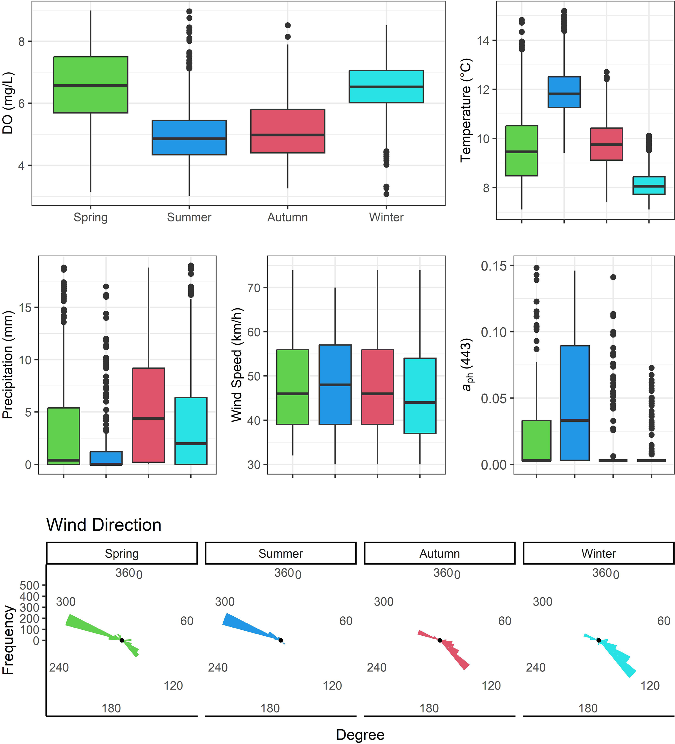 The correlation matrices of daily average minimum DO concentrations and environmental predictors showed markedly different patterns depending on seasons (Supplementary Figure 2). For example, the season for which maximum temperature had the strongest correlation with DO concentrations was in spring (ρ = -0.24), with changes in direction and magnitude in other seasons (summer ρ = 0.12; autumn ρ = -0.15, and winter ρ = -0.12). In the case of wind speed, daily average minimum DO was shown to have mildly positive correlations in autumn and winter (ρ = 0.32 and 0.28, respectively), but nearly no correlations in spring and summer (ρ = -0.05 and 0.05, respectively). The aph(443) values produced the strongest negative correlation with daily average minimum DO in autumn (ρ= -0.29), with very weak negative correlations in the spring and summer (ρ = -0.05 and -0.09, respectively), and nearly no correlation in the winter months (ρ = 0.03).