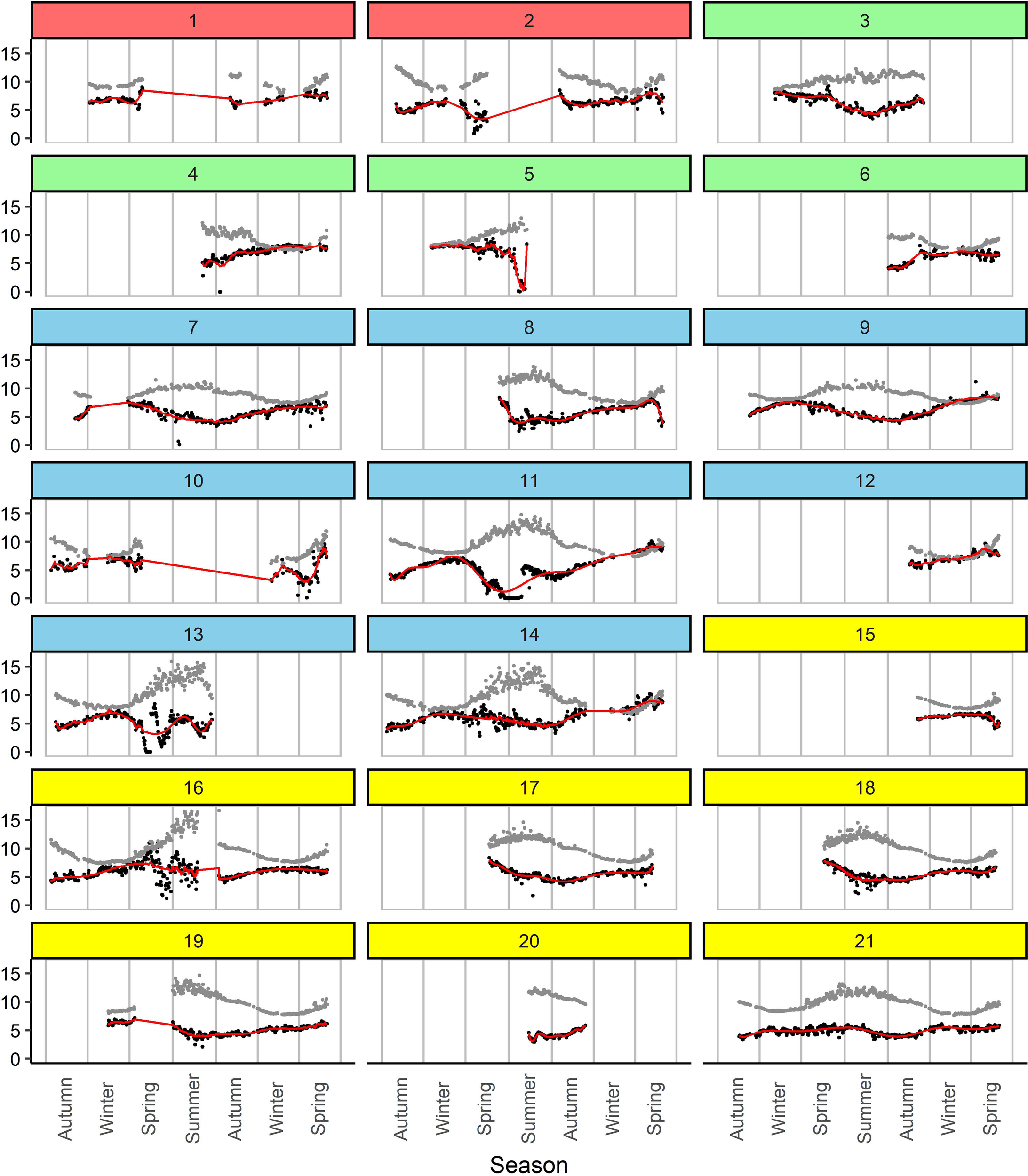 Time-series plots of daily average minimum dissolved oxygen (DO) concentration (black dots) and daily maximum temperature (gray dots) across the 21 aquaculture sites in British Columbia between October 2015 and May 2017. Y-axis represents both DO concentration (mg/L) and temperature (°C). The color for each site corresponds to its respective aquaculture area (see Figure 1).