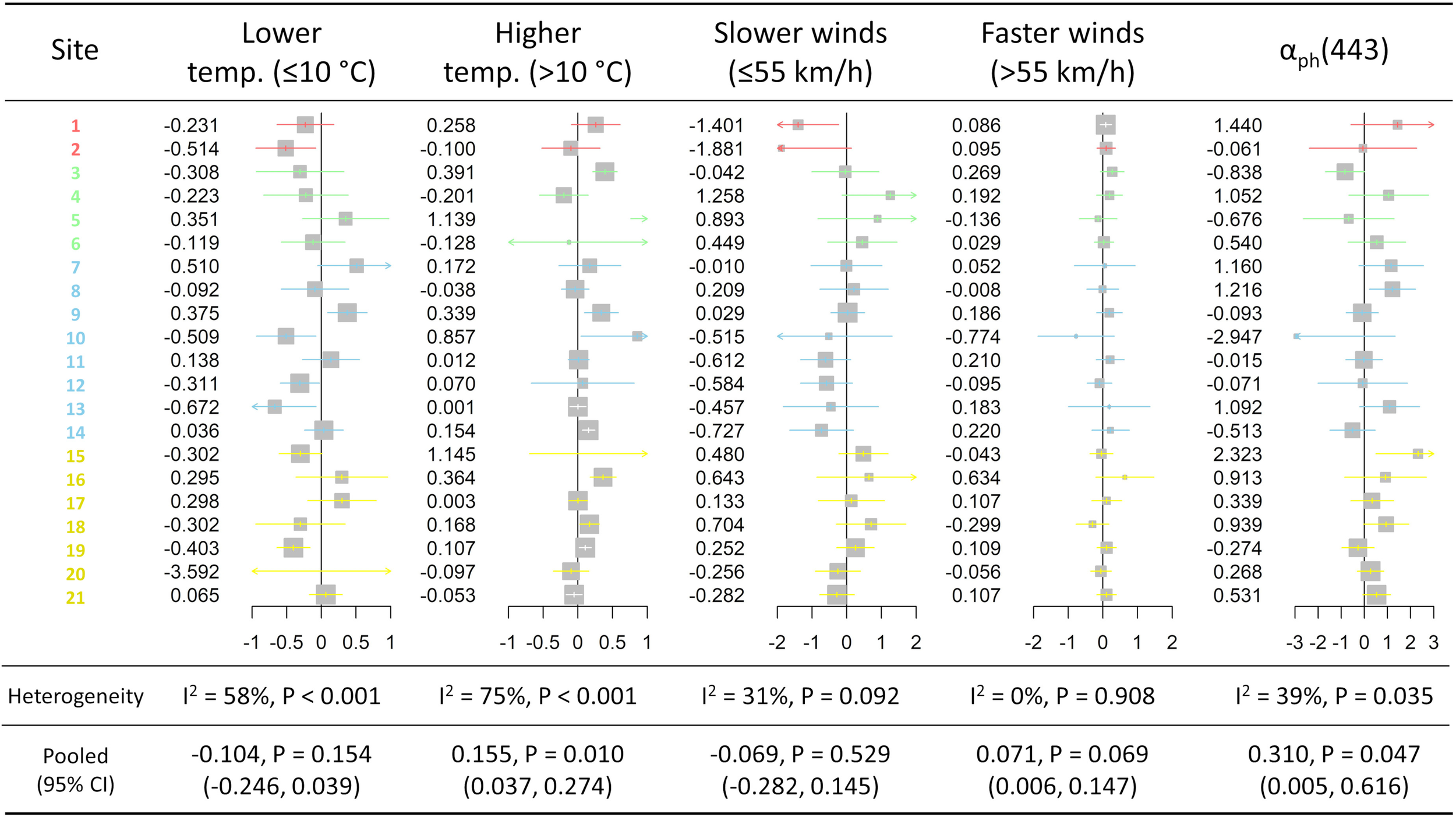 The environmental predictors, singly evaluated, included daily estimates for: maximum temperature, total precipitation, wind speed (max. gust above 30 km/h), wind direction (max. gust above 30 km/h), and regionally-averaged aph(443) coefficients. All estimates were derived from two-stage time-series regression models, with aquaculture sites (n=13) as a random effect, and time modeled for both long-term seasonal trends (cubic spline function with 7 knot per year) and short-term autocorrelation (exponential). Daily total precipitation and daily maximum wind speed were re-scaled (10-1 and 10-2, respectively). CI and I2 represent confidence interval and level of heterogeneity across the aquaculture sites, respectively.