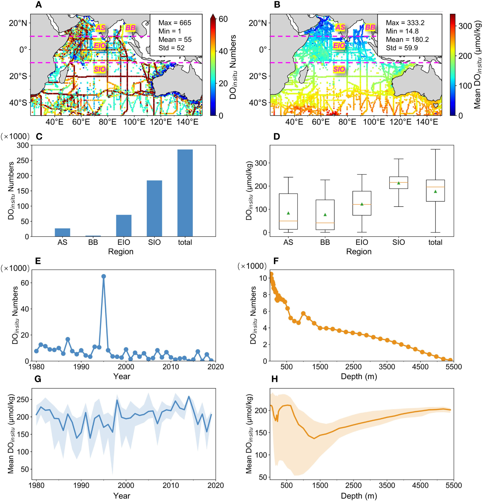 Spatiotemporal statistics of measured DO (DOin situ) in the Indian Ocean. Spatial distribution of (A) observation numbers and (B) mean DOin situ. (C) Observation numbers and (D) boxplots of DOin situ in the Arabian Sea (AS), the Bay of Bengal (BB), the Equatorial Indian Ocean (EIO), the Southern Indian Ocean (SIO), and total Indian Ocean. In (D), the orange line represents the median values of DOin situ, and the green triangle represents the mean values of DOin situ. (E) Annual observation numbers of DOin situ and (F) vertical observation numbers of DOin situ. (G) Annual median DOin situ in 1980–2019 and (H) vertical median DOin situ at depths of 0–5,395 m (50 depths). The light blue area enveloping the curve in (G) represents the annual interquartile ranges (IQR) of DOin situ, and the light orange area enveloping the curve in (H) represents the vertical IQR of mean DOin situ.