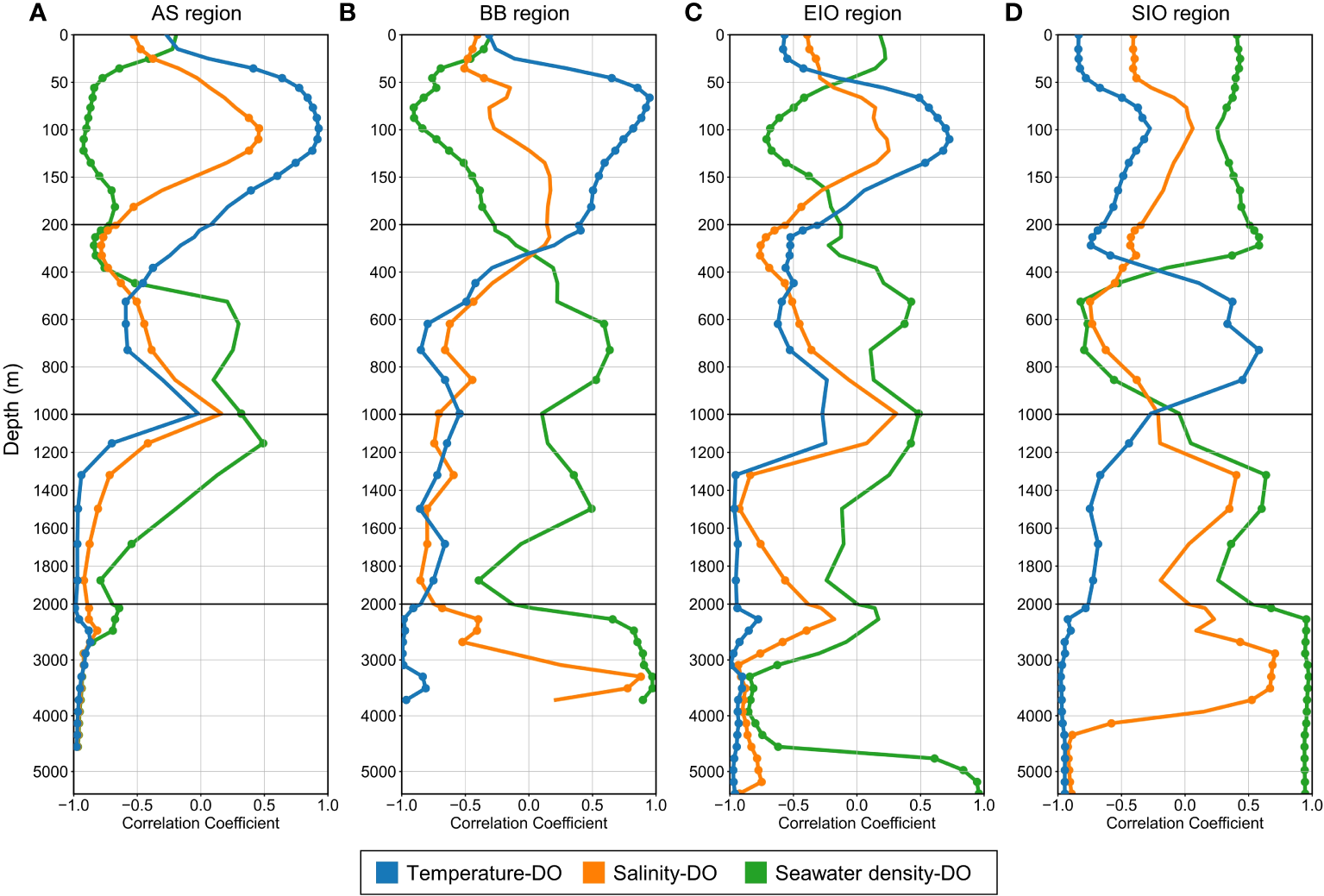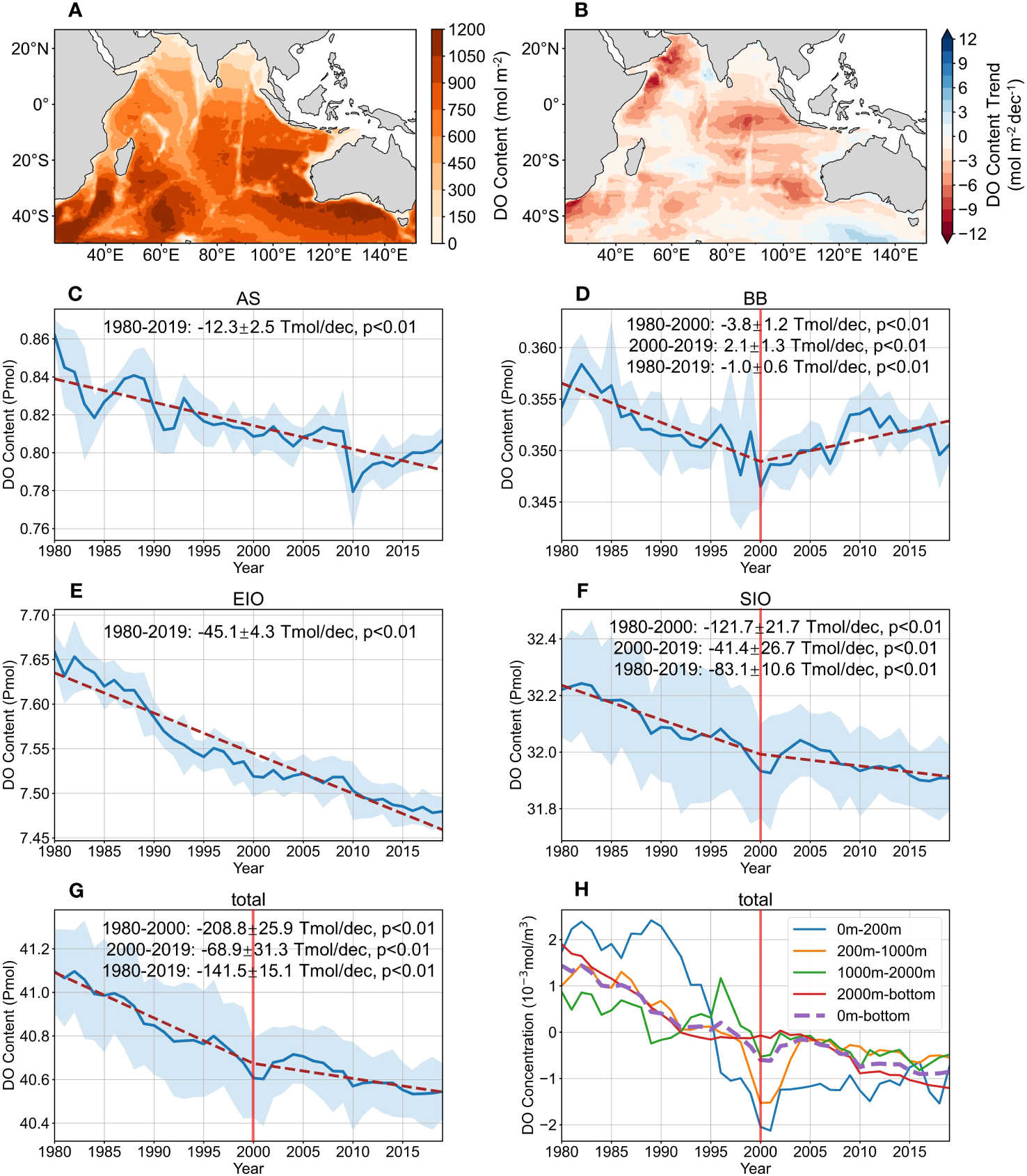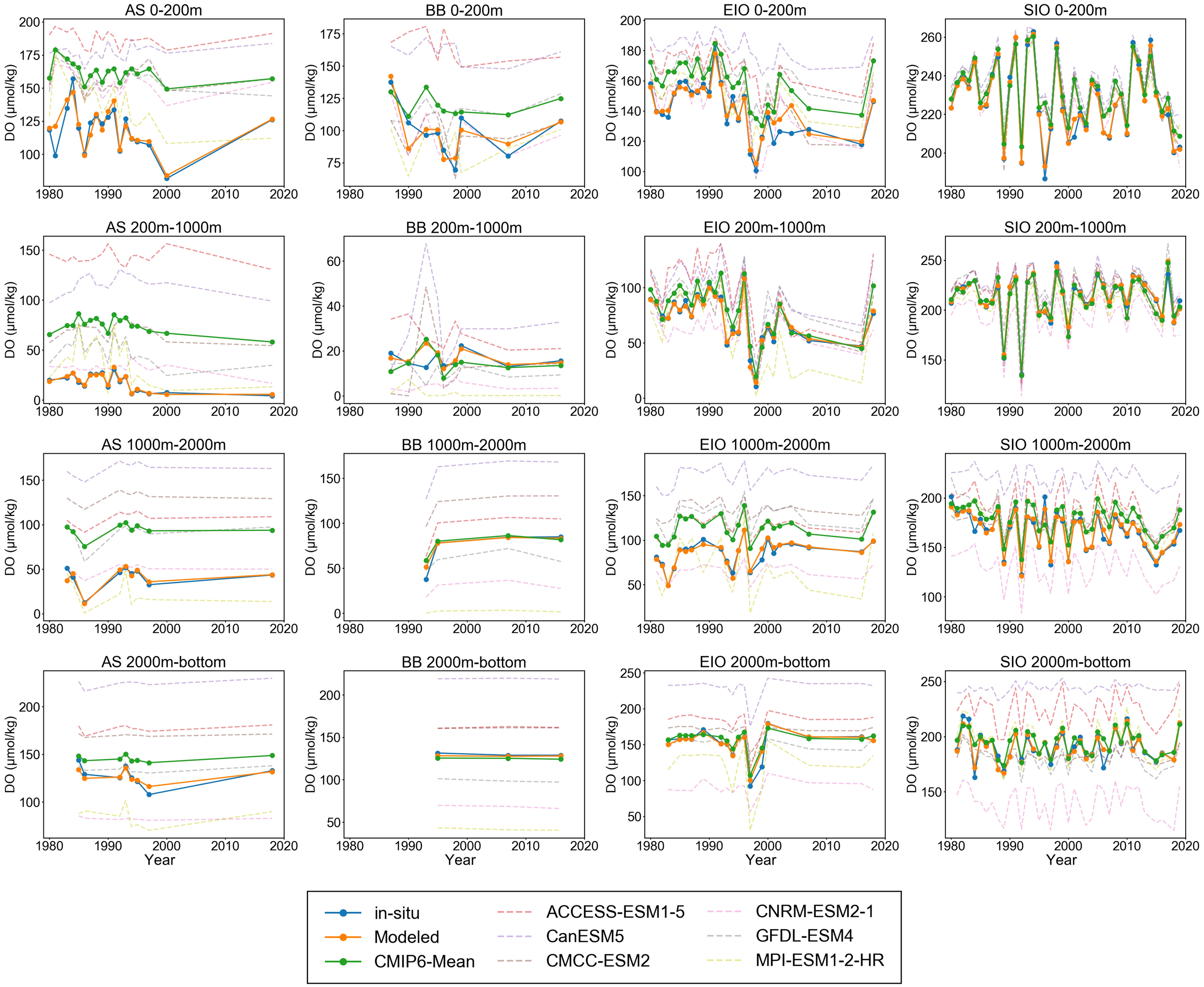 At present, DO observations in the Indian Ocean are sparse in spatiotemporal distribution, making it challenging to estimate the long-term DO trend. For instance, Schmidtko et al. (2017) mapped the global spatial DO trend distribution based on multiple measured databases, but their study lacked continuous DO time series in the AS and BB and avoided estimating trends in those regions due to low data coverage. Furthermore, although many Earth System Models (ESMs) attempt to simulate global oceanic DO, these models do not incorporate data assimilation with actual observations. Consequently, numerical models consistently underestimate the actual DO decline trends (Bopp et al., 2013; Cocco et al., 2013; Long et al., 2016; Kwiatkowski et al., 2020). Additionally, existing research in the Indian Ocean often focuses on the small parts of OMZs, while comprehensive analyses and regional comparisons of DO and its relationship with marine environmental changes are still relatively limited.