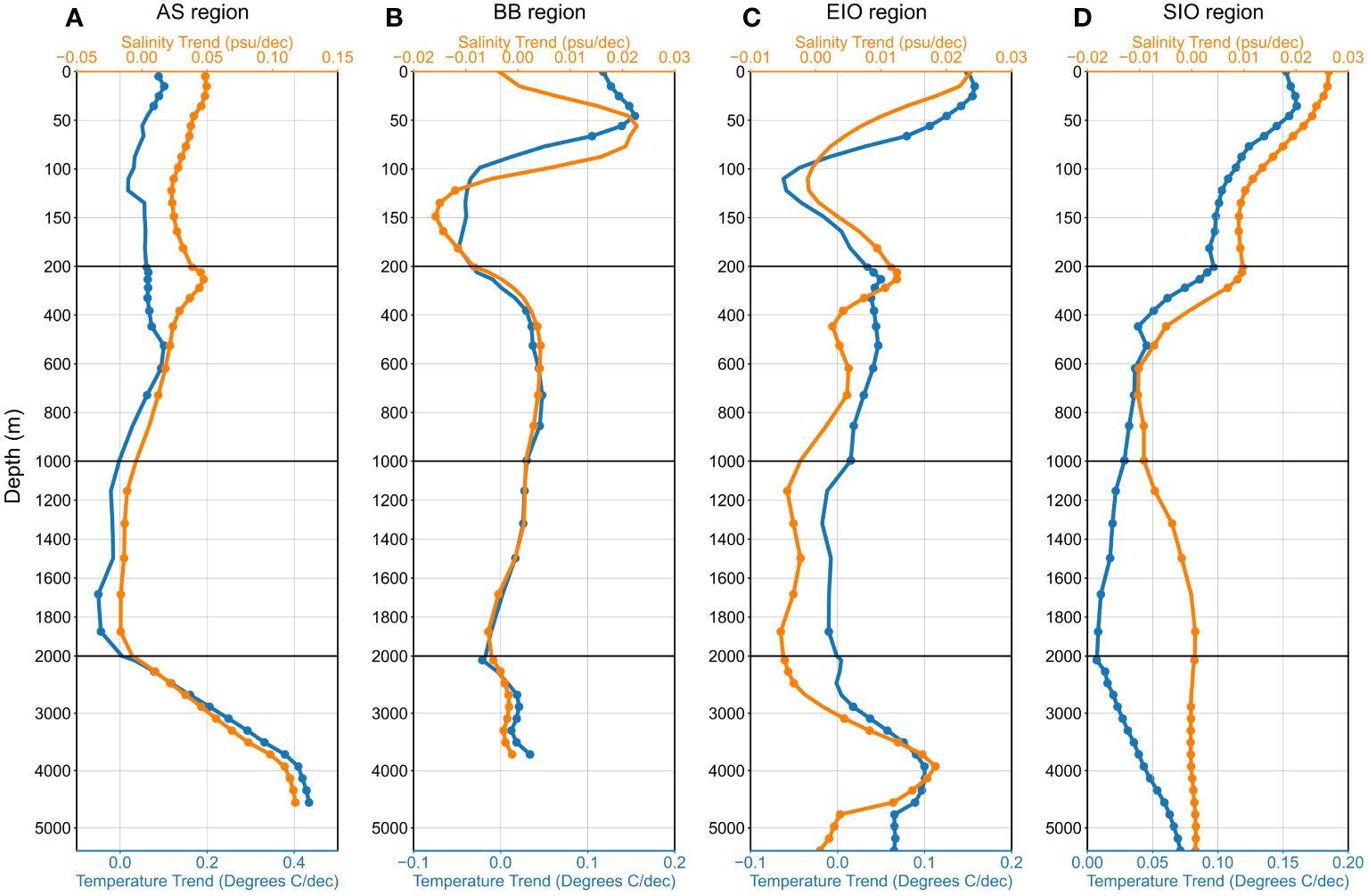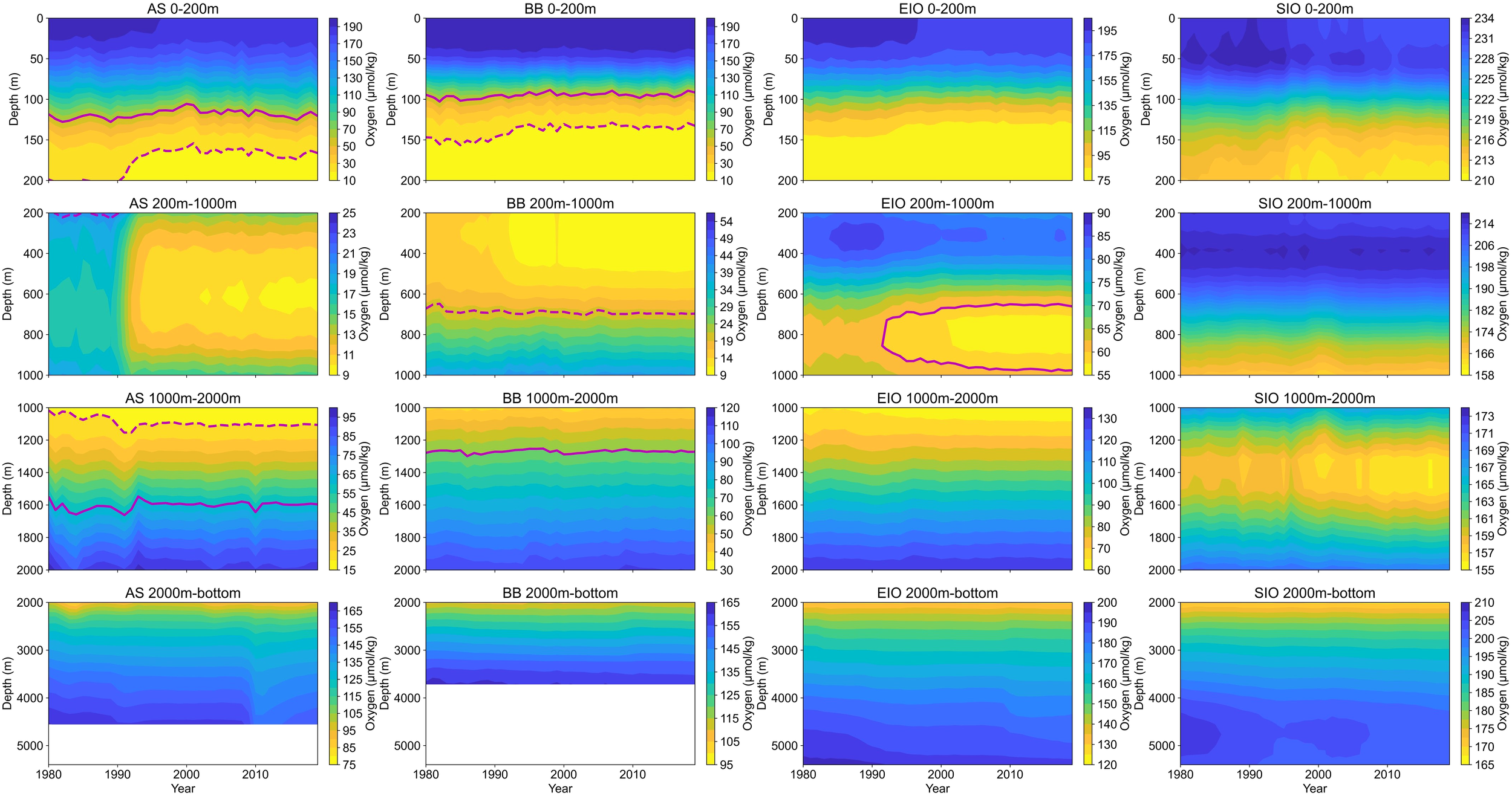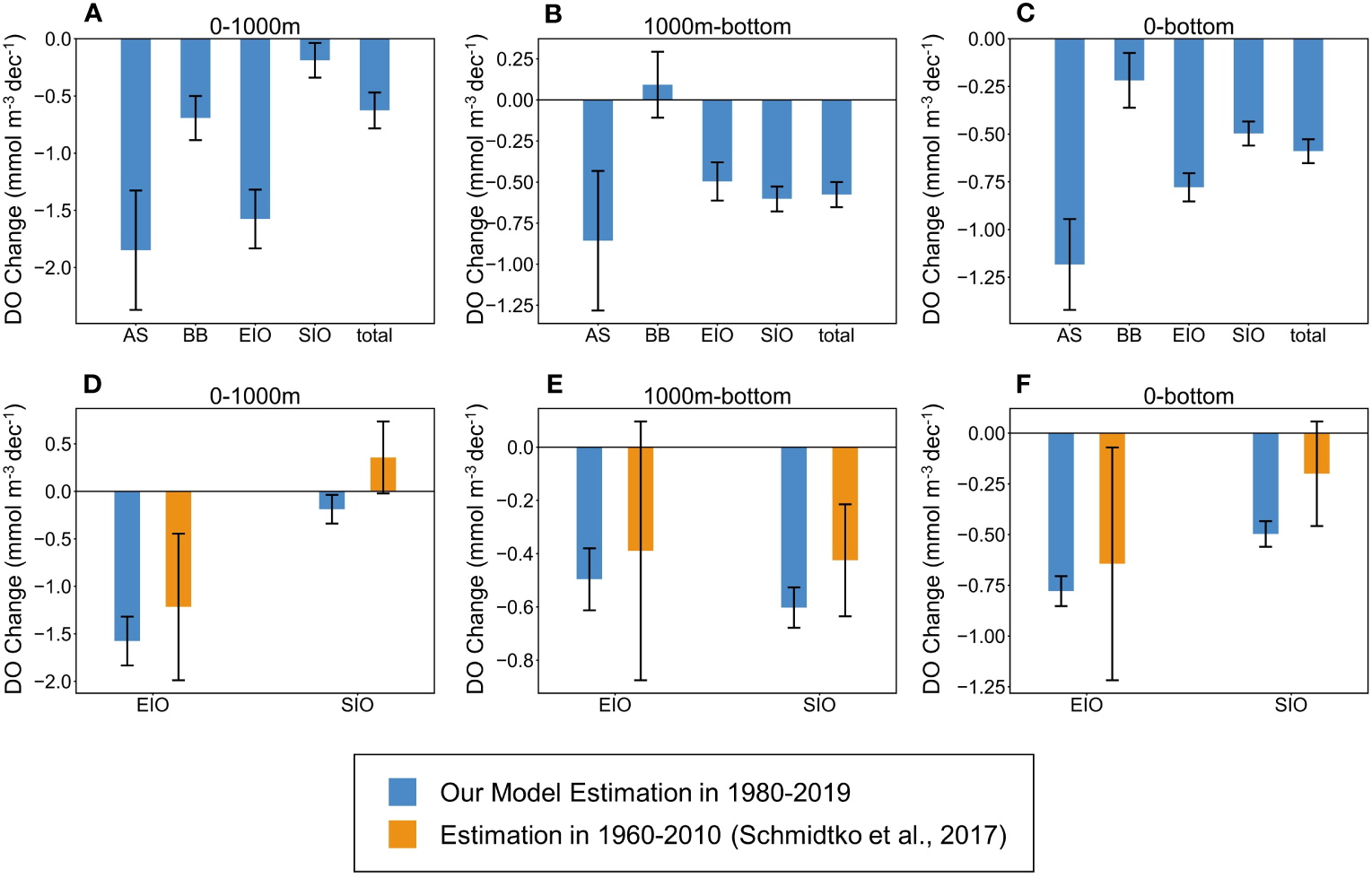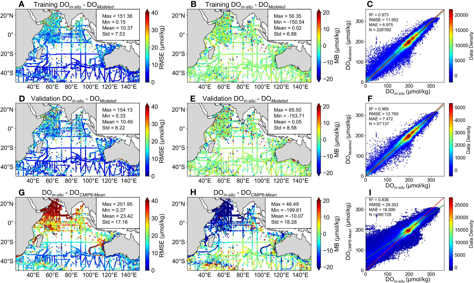 At present, DO observations in the Indian Ocean are sparse in spatiotemporal distribution, making it challenging to estimate the long-term DO trend. For instance, Schmidtko et al. (2017) mapped the global spatial DO trend distribution based on multiple measured databases, but their study lacked continuous DO time series in the AS and BB and avoided estimating trends in those regions due to low data coverage. Furthermore, although many Earth System Models (ESMs) attempt to simulate global oceanic DO, these models do not incorporate data assimilation with actual observations. Consequently, numerical models consistently underestimate the actual DO decline trends (Bopp et al., 2013; Cocco et al., 2013; Long et al., 2016; Kwiatkowski et al., 2020). Additionally, existing research in the Indian Ocean often focuses on the small parts of OMZs, while comprehensive analyses and regional comparisons of DO and its relationship with marine environmental changes are still relatively limited.