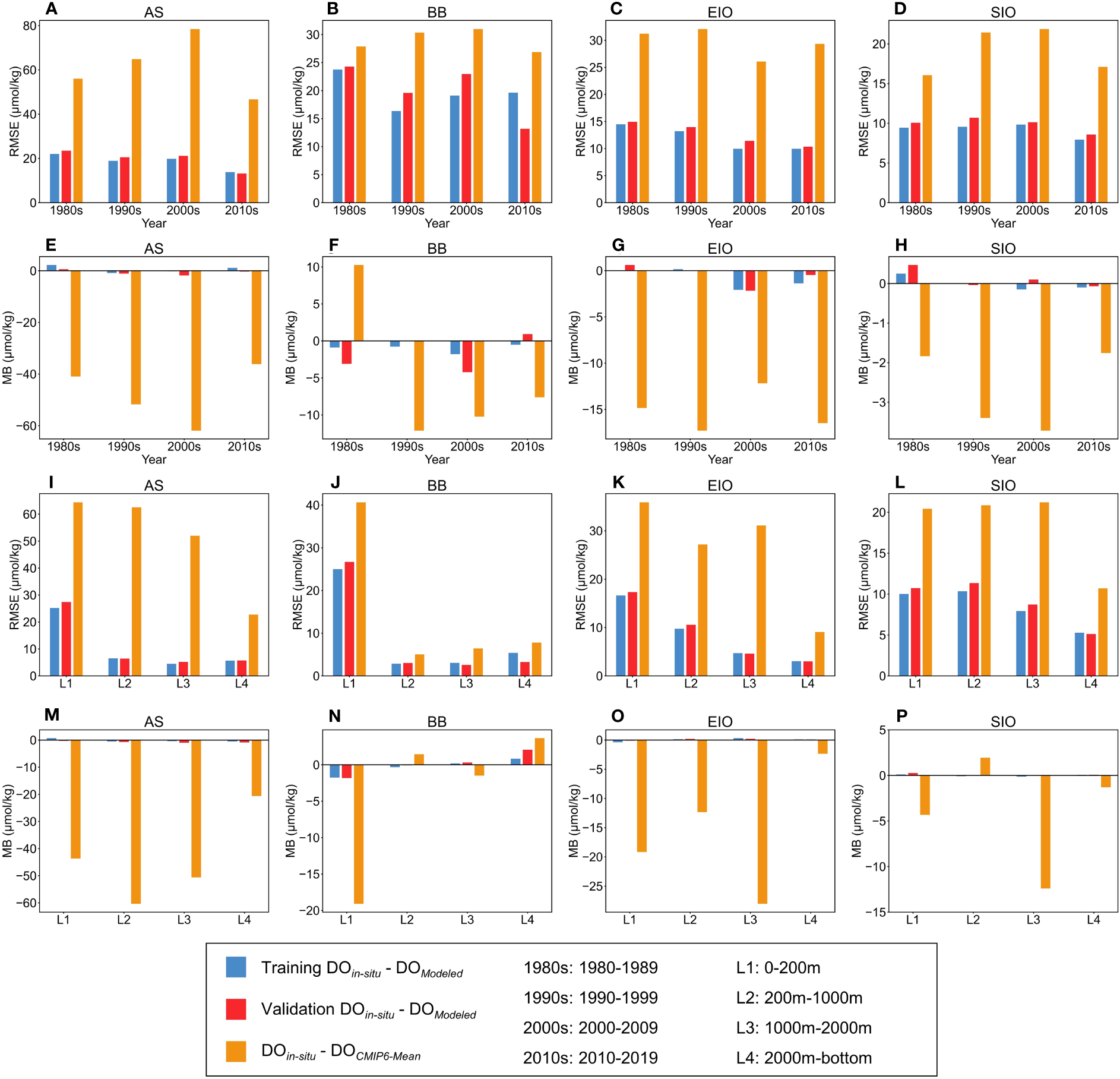 The spatial distribution of DOin situ established in section 2.2 is shown in Figure 1. Each grid had an average of 55 ± 52 observation points, and spatial mean DO concentration was 180.2 ± 59.9 μmol kg−1. The AS, EIO, and SIO regions contained relatively dense DO records, with over 27,000, 71,000, and 184,000 observations, respectively, whereas the BB region had sparse DO records with only approximately 3,000 observations. By analyzing box plots (Figure 1D), it was observed that DOin situ were not normally distributed. Therefore, we conducted a statistical analysis of DOin situ distribution using the median and interquartile range (IQR). Median DO concentrations in the AS, BB, EIO, SIO, and total Indian Ocean were 49.4 μmol kg−1 (IQR = 153.7 μmol kg−1), 41.2 μmol kg−1 (IQR = 129.1 μmol kg−1), 121.0 μmol kg−1 (IQR = 104.0 μmol kg−1), 215.9 μmol kg−1 (IQR = 51.5 μmol kg−1), and 196.3 μmol kg−1 (IQR = 92.3 μmol kg−1), respectively.