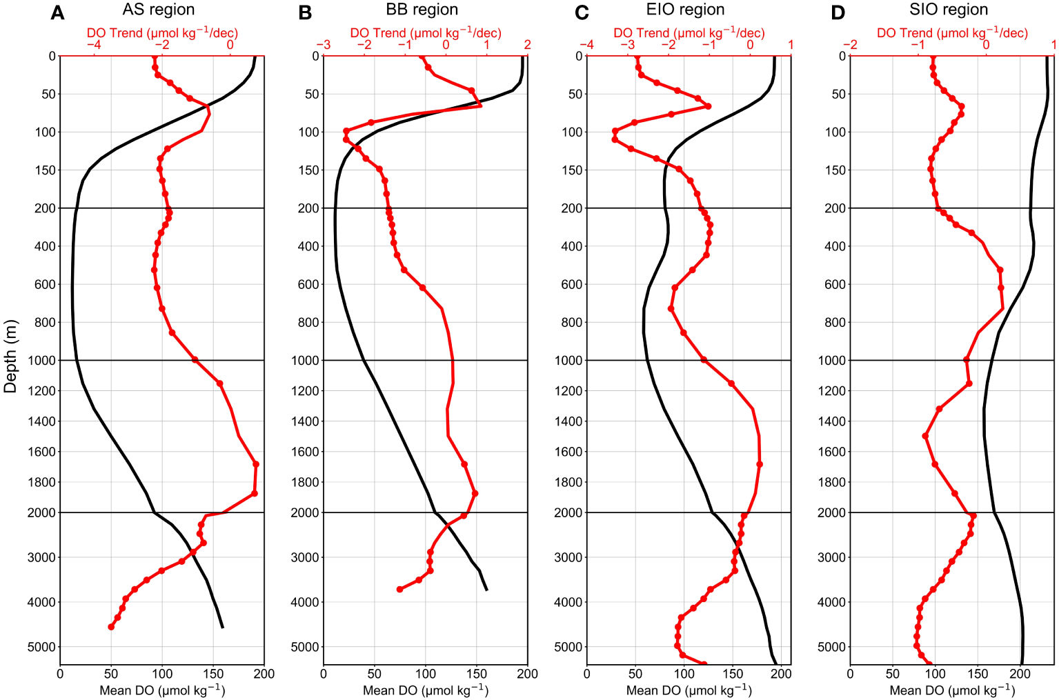 The study utilizes DO measurement data obtained from the Ocean Station Data (OSD) and Conductivity–Temperature–Depth (CTD) datasets in the World Ocean Database 2018 (WOD18) (Boyer et al., 2018), which were downloaded from https://www.ncei.noaa.gov/products/world-ocean-database. The DO data in the OSD span from 1878 to 2020, and the DO data in the CTD span from 1971 to 2020. We only considered the data up to 2019 because the Indian Ocean has no observational records in 2020. DO records in the OSD and CTD datasets have the temporal resolution accurate to the day and hour. Schmidtko et al. (2017) have suggested a high degree of consistency between these two databases, allowing us to assume their congruence.