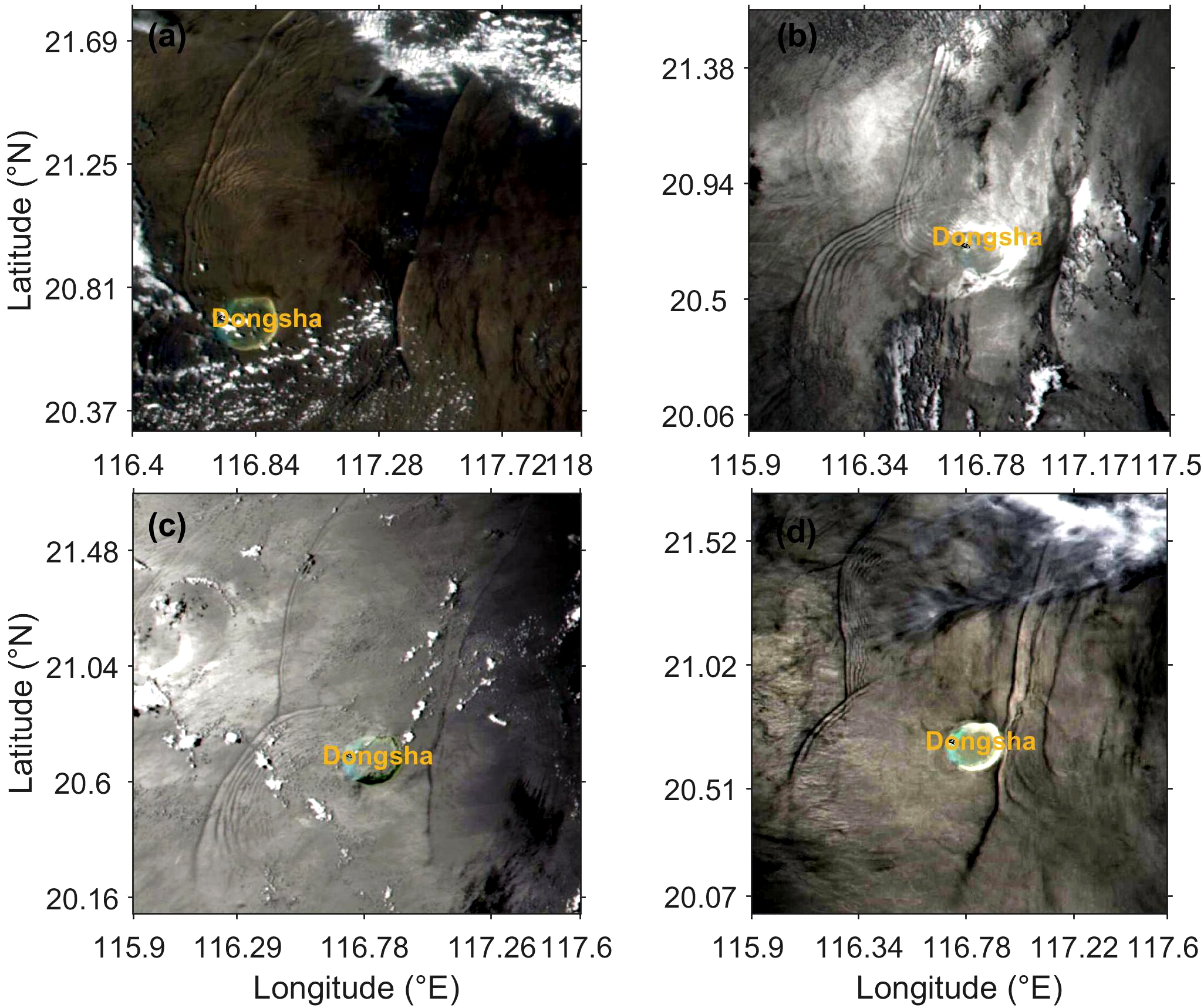 Satellite images exhibit the phenomenon of wave interactions near Dongsha Island. (A–D) are satellite images on 20 April 2019, 16 May 2020, 24 May 2021, 22 July 2021, respectively.