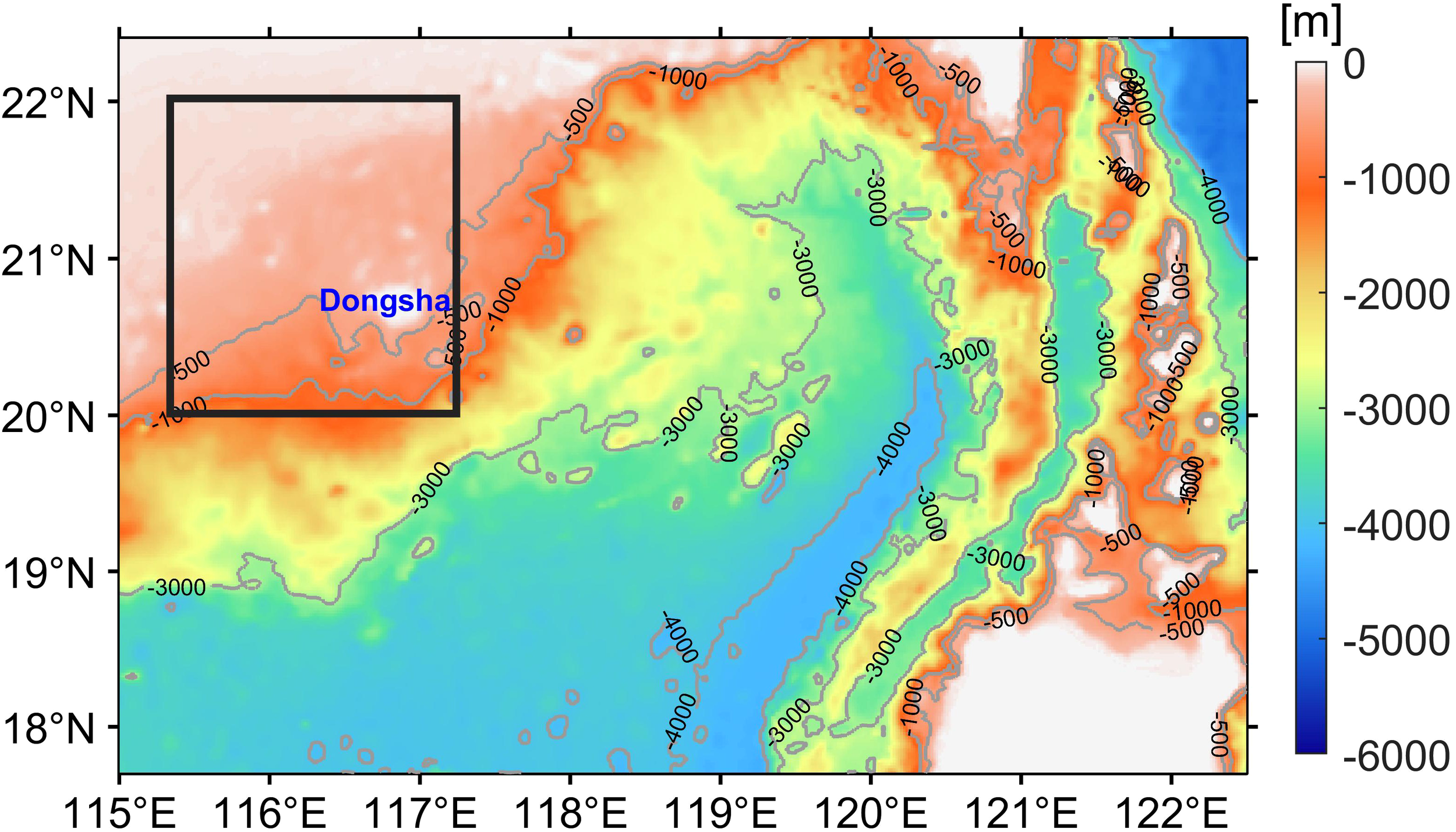 The South China Sea is known as one of the areas where internal waves are widespread and most of them are caused by tides. In order to study the oblique wave-wave interactions and their impacts in the South China Sea, we carry out a three-dimensional high-resolution simulation of the South China Sea using the MITgcm model, which uses the non-hydrostatic approximation. The simulated area is 115°E-122.5°E, 17.7°N-22.4°N (Figure 2). We use a Cartesian coordinate system in the horizontal directions and z-coordinate in the vertical direction. Since the propagation direction of internal waves in the northern South China Sea is mostly westward or north-westward (Guo et al., 2021) and save resources as much as possible on the basis of satisfying the accuracy, the grid resolution is set to be 500m in the x-direction (East-West direction) and 1000m in the y-direction (North-South direction). In the vertical direction, we use non-uniform grids with a dense grids in the upper ocean and sparse grids in the deep ocean. There are 147 layers in the vertical direction, and the total water depth of the model is set to be 5200m. The layer depth gradually transitions from 1m near the surface to 300m near the bottom. The total number of grid points is 1485×504×147. The topographic data is selected from the GEBCO2020 dataset with a resolution of 1/120°×1/120° (Figure 2), which is interpolated onto the selected grid. To ensure the stability of the model, the minimum water depth of the model is set to 10 m. The viscosity coefficients in the horizontal and vertical directions are uniformly 1.0×10−3 m2/s and 1.0×10−6 m2/s, respectively. The Nonlocal K-Profile Parameterization (KPP) scheme of Large et al. (1994) is used for vertical mixing.