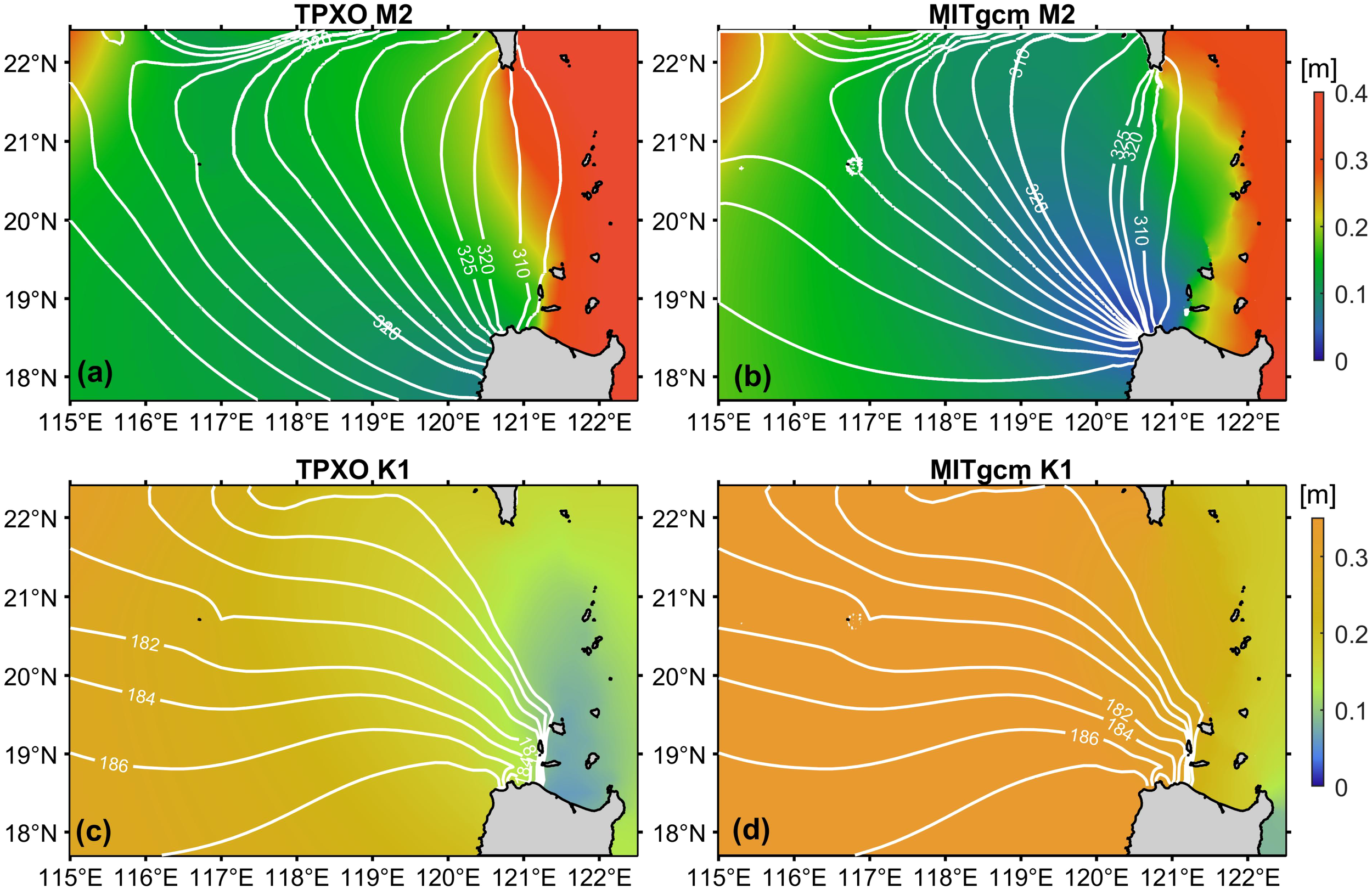 Cotidal chart for M2 and K1 in the simulated area based on TPXO (A, C) and MITgcm (B, D) results, where the colors indicate the amplitude and white solid lines represent the phase.