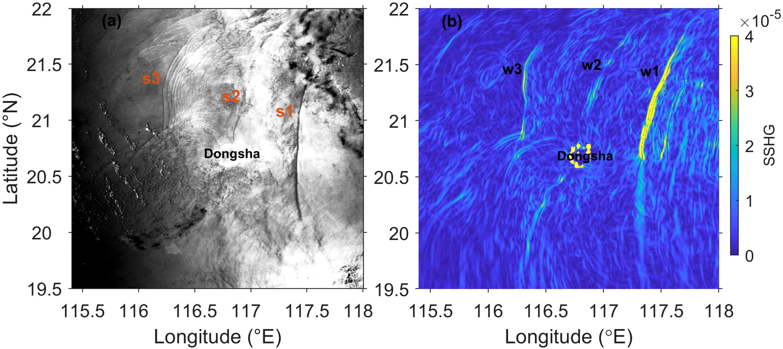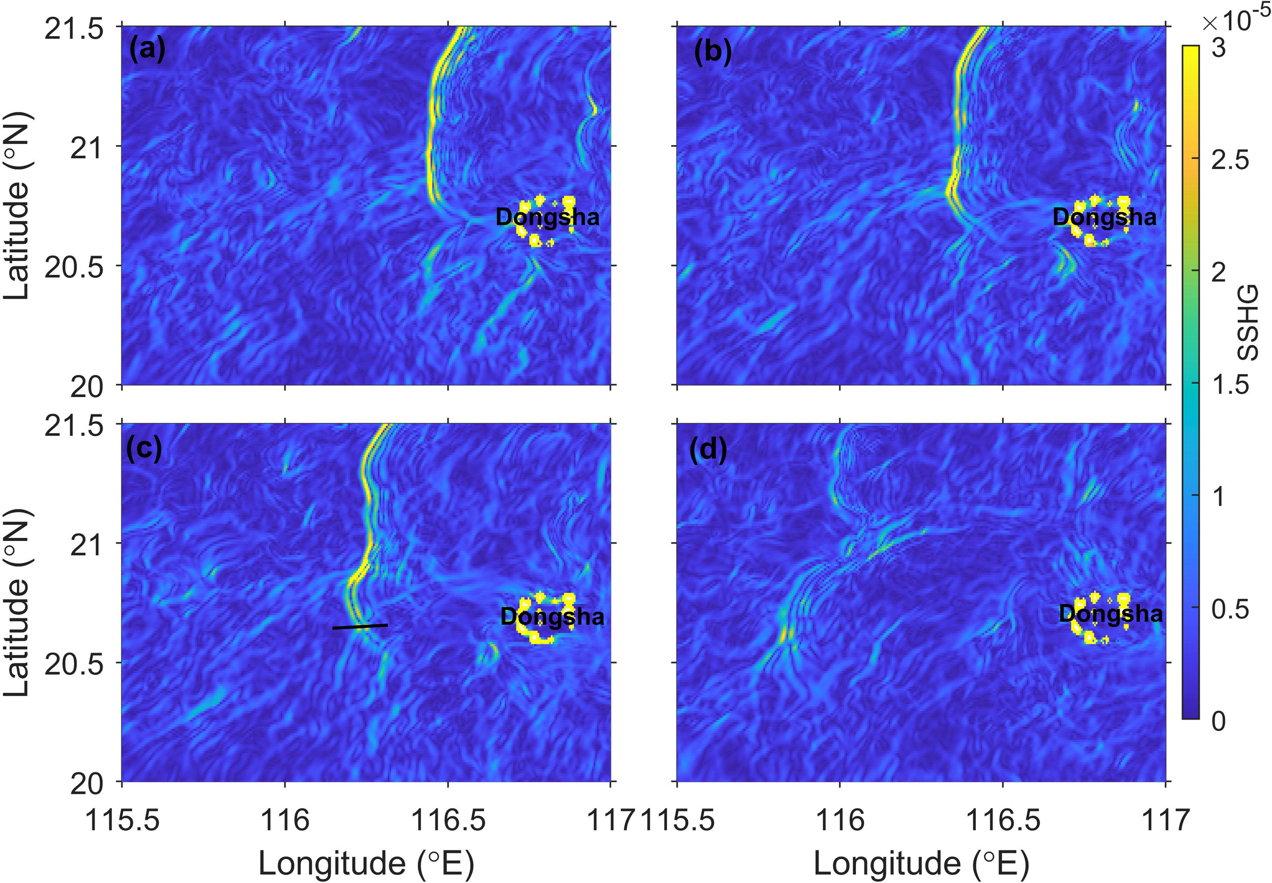 The ISWs can cause the sea surface to converge or diverge, so as to adjust the roughness of the sea surface, which can be recognised as alternating dark and bright ripples on the satellite images. So the basic information of ISWs can be obtained from the satellite images (Liu et al., 1998). Therefore, we can validate the model from the two-dimensional perspective by comparing the satellite data with the model results. Sea surface height gradient (SSHG) can portray the spatial position of internal waves in two-dimensional perspective, and the formula for SSHG is
