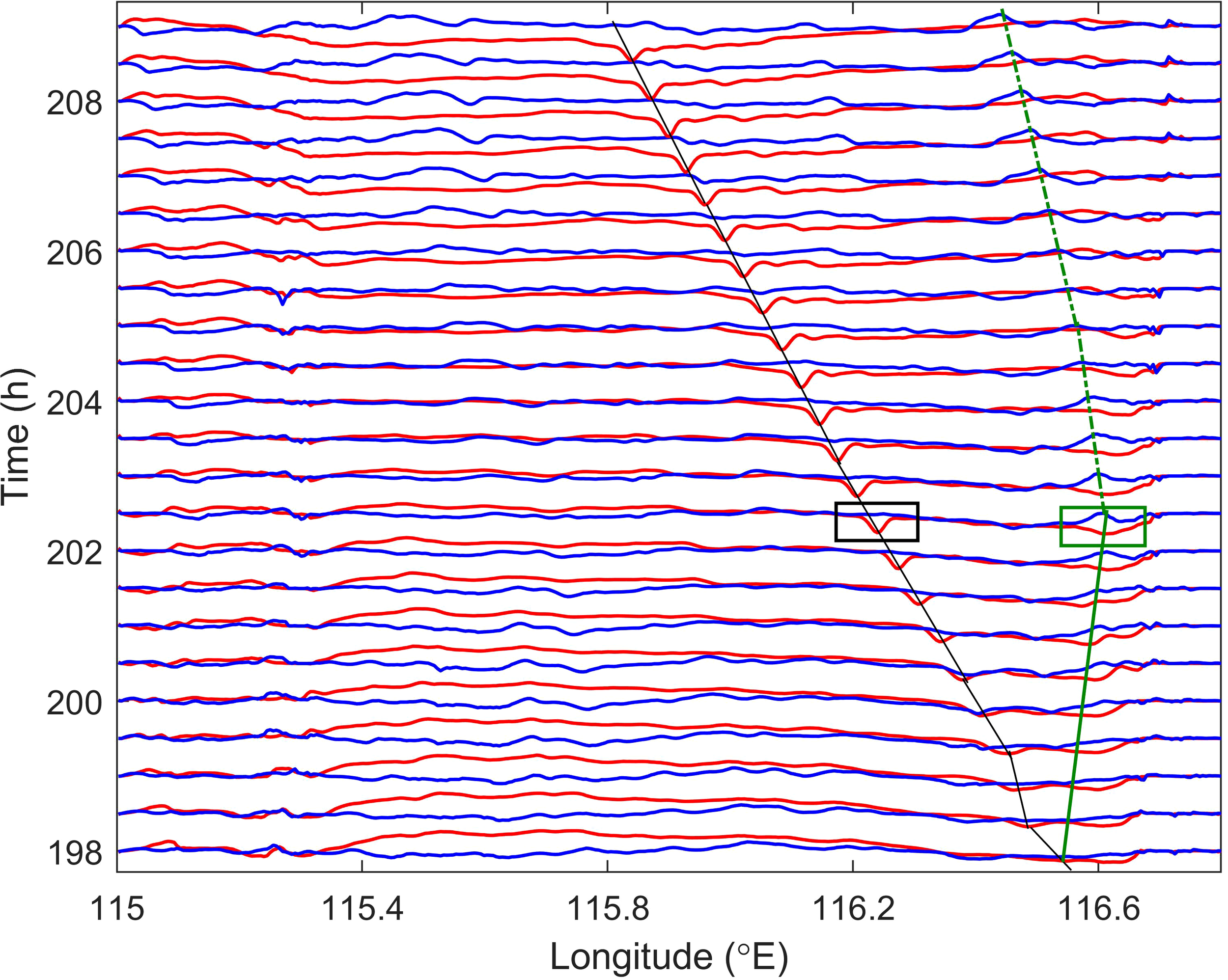 In recent years, more and more studies have begun to focus on the interactions between ISWs and these studies mostly rely on theoretical analysis or satellite images. For example, Hsu and Liu (2000) analyse several hundred satellite images from 1993 to 1999 and find that ISWs occur complex wave-wave interactions after refraction by the topography on the west of Dongsha Island, and one of the obvious features is the phase shift and wavelength change after wave-wave interactions. Chen et al. (2011) find that oblique wave-wave interactions between two ISWs can induce a third ISW through satellite remote sensing images of the South China Sea, and further use the ‘quasi-3D’ Kadomtsev-Petviashvili (KP) equation to provide an explanation on this phenomenon. Differences in the initial amplitude and angle of the incident wave lead to different evolutionary paths and amplitude distributions of the wave-wave interactions, which theoretically predicts the possibility of ‘Mach stem’ (the amplitude of which can be up to four times of the initial amplitude, reflecting the characteristic of a strong nonlinearity) in a typical oceanic background, and emphasises the modulation of the shallow topography (Yuan and Wang, 2022). Elevated amplitudes have a significant impact on the biology of the oceans as well as on the use of industrial technologies such as oil drilling platforms.