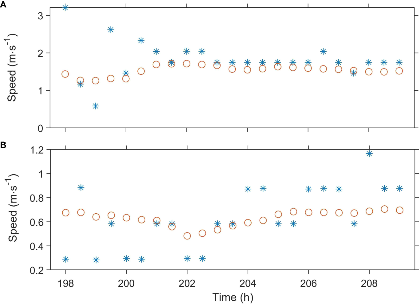 (A, B) represent the variations of phase speed of the first and second mode wave, respectively. The red circles represent the theoretical phase speed of the first and second mode wave, and the blue asterisks represent the numerical speed of the first and second mode wave.