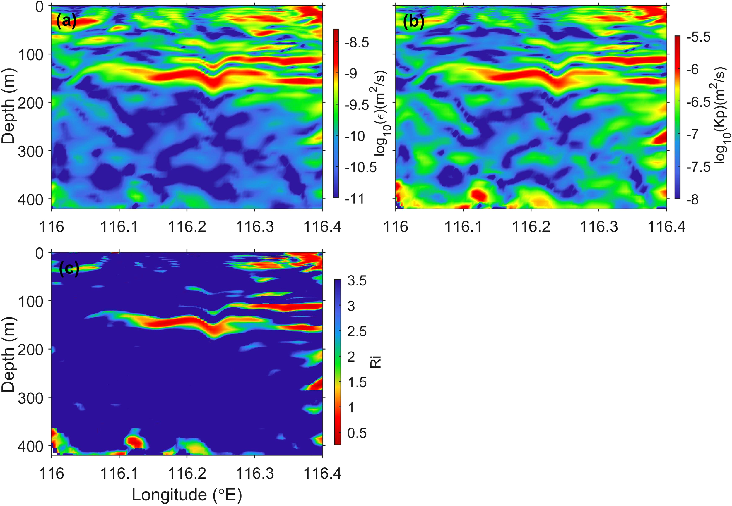 Mixing in marginal seas plays an important role in global ocean circulation and heat transport. The South China Sea is one of the largest marginal seas in the Pacific Ocean, characterised by complex seabed topography and strong tidal currents. Turbulent mixing is also one of the main pathways for energy transport in the global ocean. The crossed ISW propagates to around 116.24°E at time 202.5h. The profile (marked by the solid black line in Figure 7C) at 20.64°N is selected, and the turbulent kinetic energy dissipation rate, mixing rate, Ri are calculated on this profile at time 202.5h through Equations (5–8) (Figure 10).