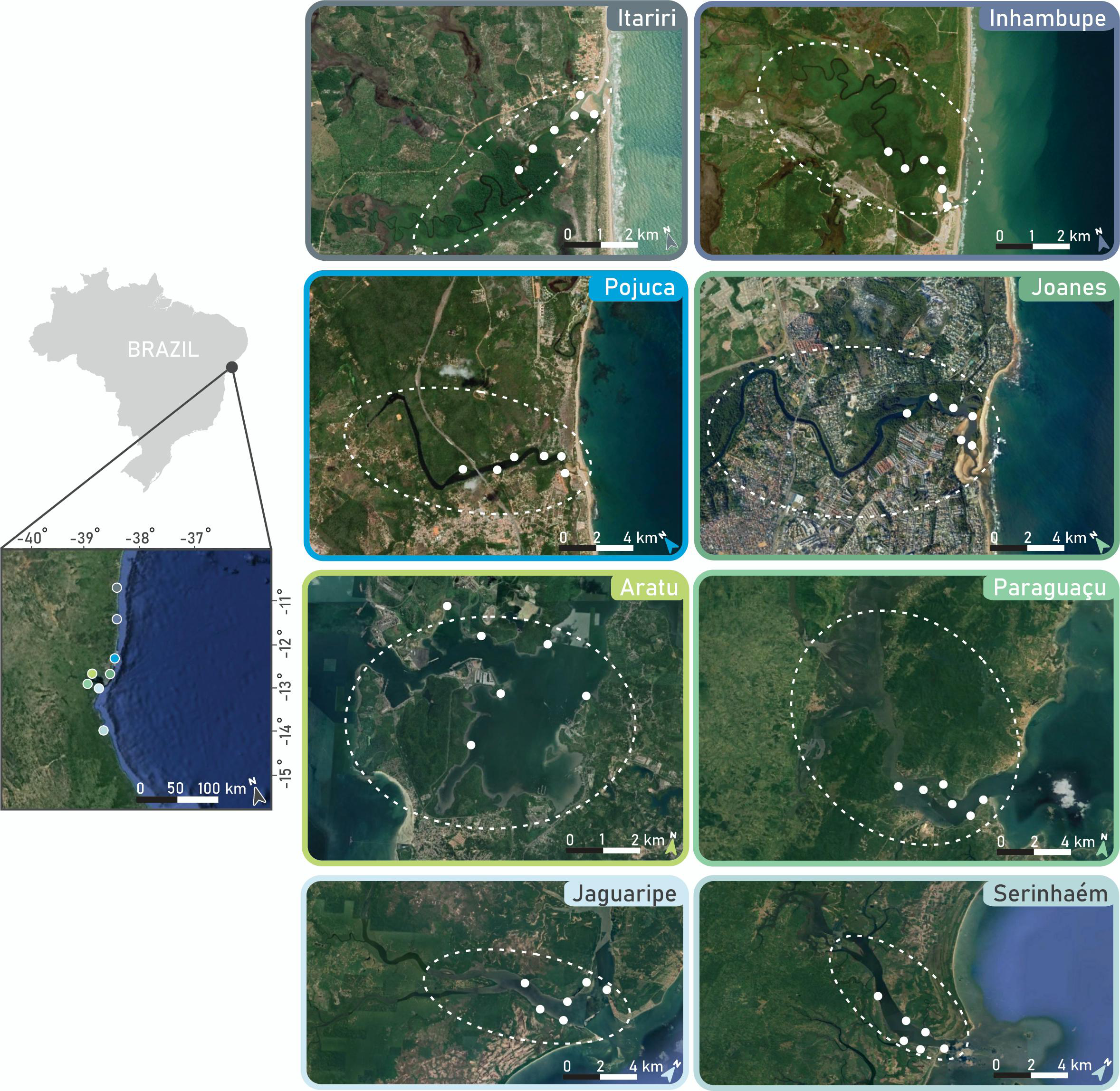 The study encompassed eight estuaries along a 500-km stretch of the Brazilian central coast (Figure 1). The Itariri, Inhambupe, Pojuca, and Joanes estuaries have a smaller drainage basin and direct connections to the ocean. Conversely, the Paraguaçu, Jaguaripe, Aratu Bay, and Serinhaém estuaries have larger areas and flow into an inner bay before reaching the ocean. All of these estuaries are characterized by symmetric diurnal tides ranging between 2.1 and 2.4 m (Cirano and Lessa, 2007). The study region experienced an average annual rainfall of approximately 210 mm, with a rainy season from March to August (mean monthly precipitation ~280 mm) and a dry season from September to February (~110 mm per month). Three estuaries (Pojuca, Joanes, and Aratu Bay) underwent significant coastal development pressures, including urbanization, pastureland use, reduced mangrove cover, port development, or industrialization, while the other five (Itariri, Inhambupe, Paraguaçu, Jaguaripe, and Serinhaém) remained relatively little affected by coastal development.