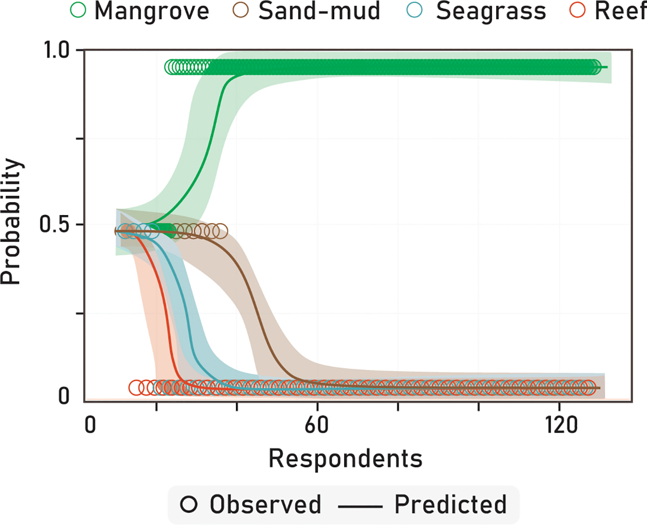Logistic Regression representations regard to answers of fishers on occurrence habitats for juveniles of the cubera snapper. The slope of the binary logistic regression line indicates the predicted probability of cubera snapper occurrence in each habitat type, taking into account the number of fishers interviewed in all estuarine systems.